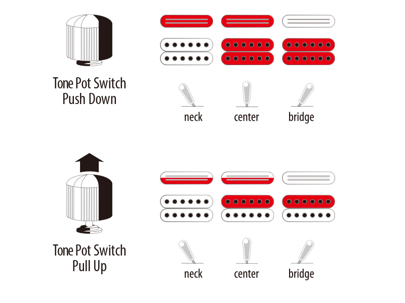 高域成分の抜けを促し、小ボリューム時に音の明瞭さを引き出すハイ・パス・フィルター(ボリューム・ポッド引き上げ時) / フロント&リア・ハムバッキング・ピックアップのコイルタップ可能(トーン・ポッド引き上げ時)。