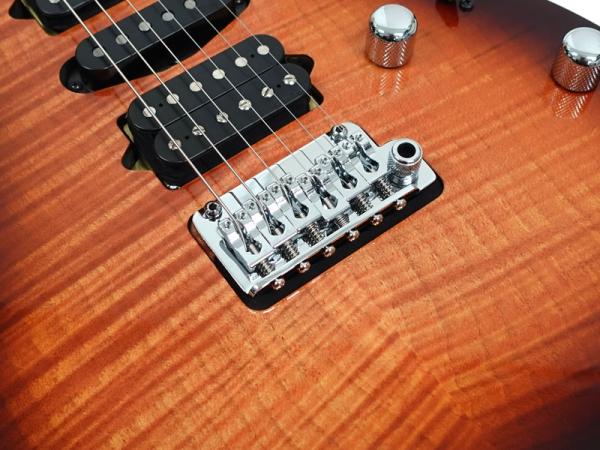GOTOH製マグナムロックペグ、シンクロトレモロ、ステンレスフレット、ボディのコンターやネックジョイント部の球面仕上げ、蓄光素材のサイドポジションマークなど現代的な演奏性の高さを求めてひと手間ふた手間かけた拘りの感じられる一本。