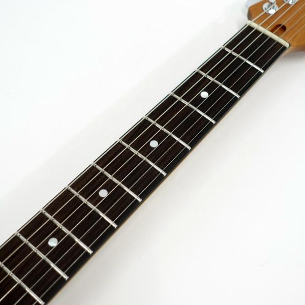 GOTOH製マグナムロックペグ、シンクロトレモロ、ステンレスフレット、ボディのコンターやネックジョイント部の球面仕上げ、蓄光素材のサイドポジションマークなど現代的な演奏性の高さを求めてひと手間ふた手間かけた拘りの感じられる一本。