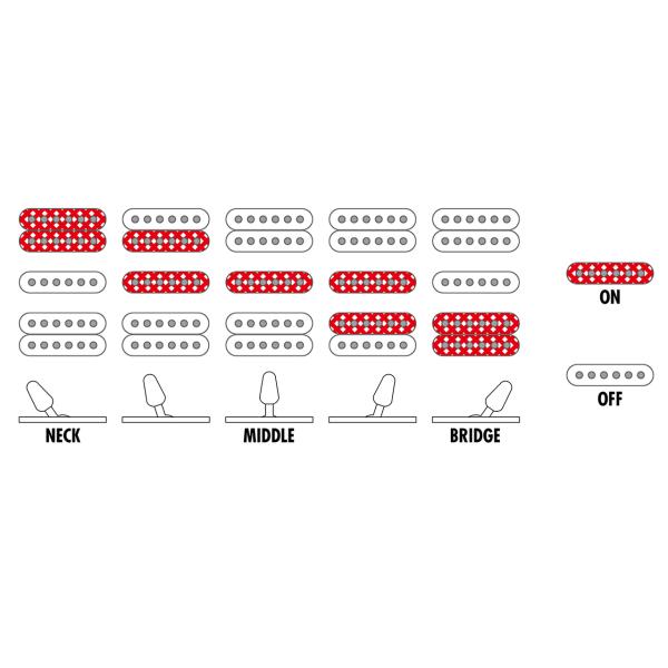 ラウド・ミュージック全盛となった90年代後半に多く採用されたV7/V8ピックアップを採用しています。パワフルな中域、高域の抜けに配慮したフロント(V7)、低域のパワーに配慮したリア(V8)が特徴です。シングル・ピックアップはV7/V8との組み合わせを前提に設計されたS1を搭載しています。