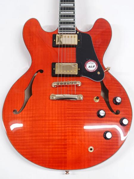 トラディショナルなFホールセミホロウフレイムメイプルボディ、メイプルセットネック、ミカルタ指板。