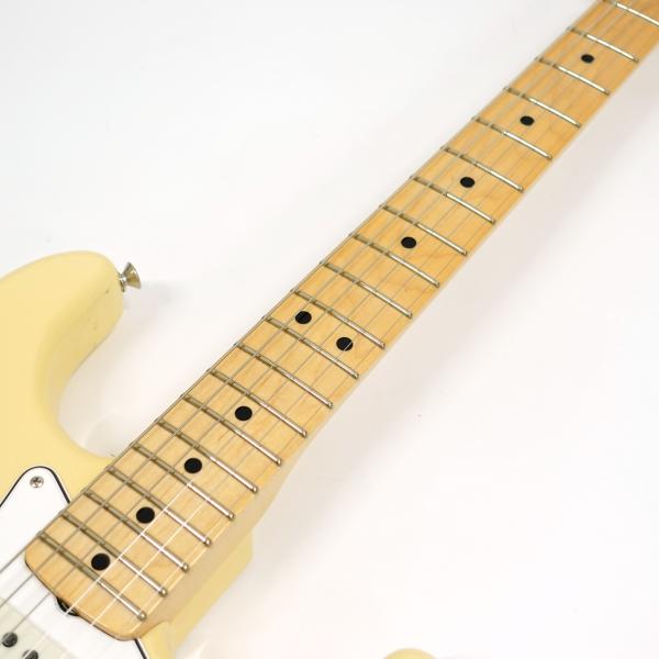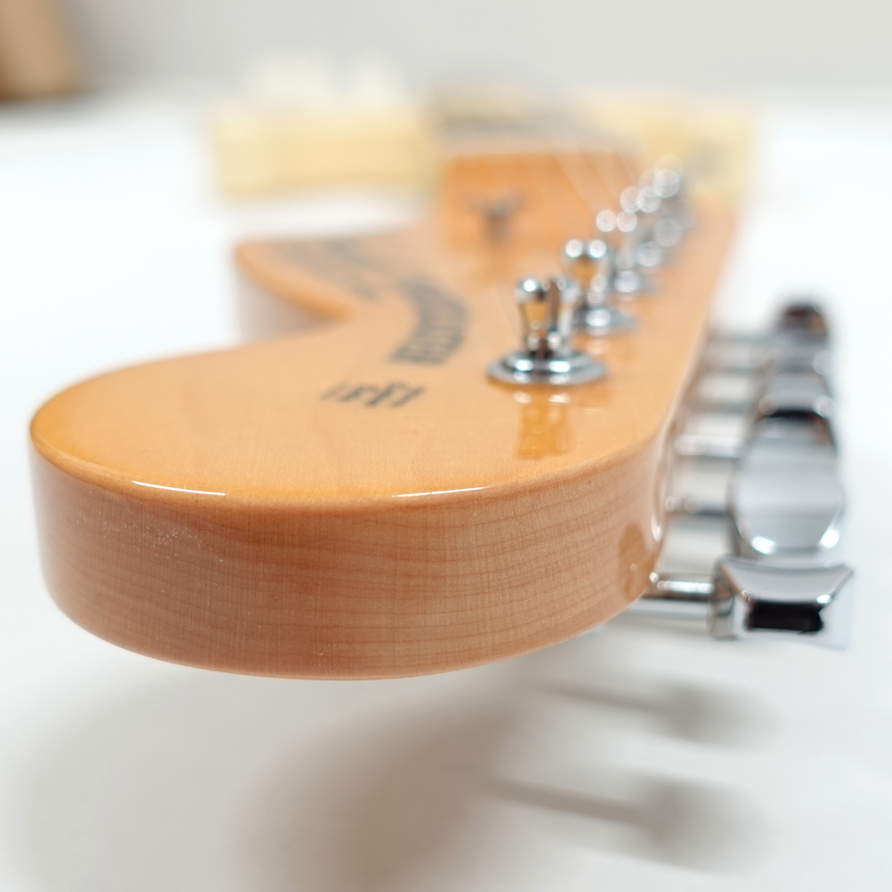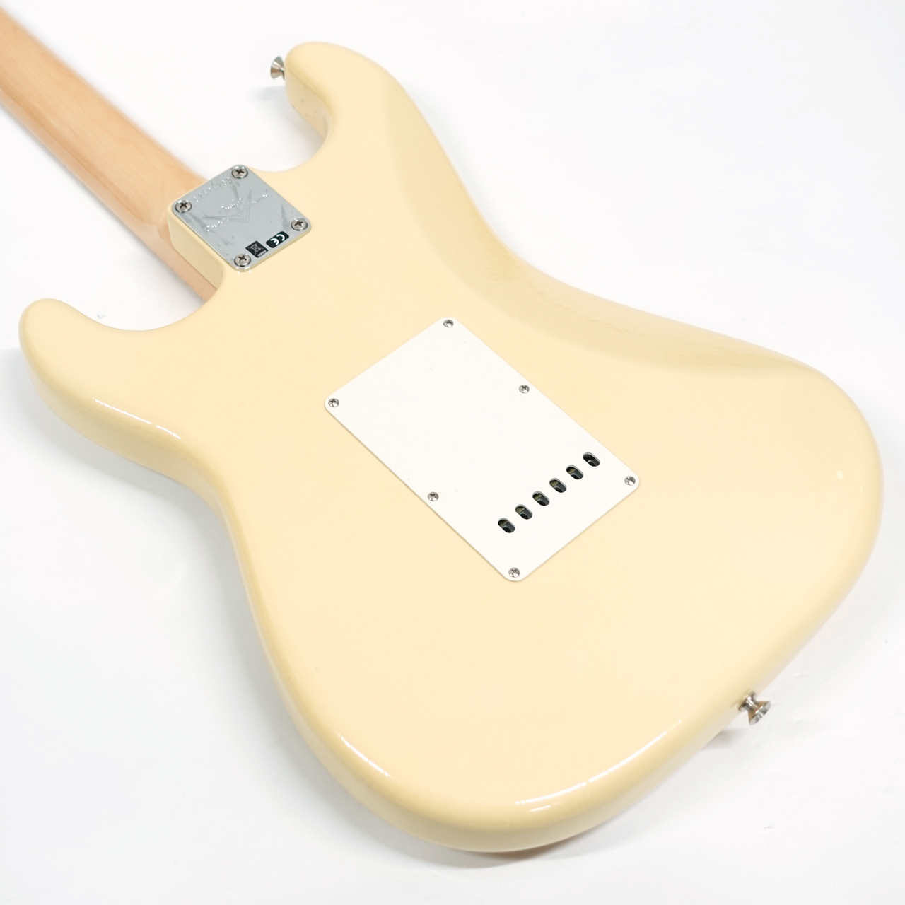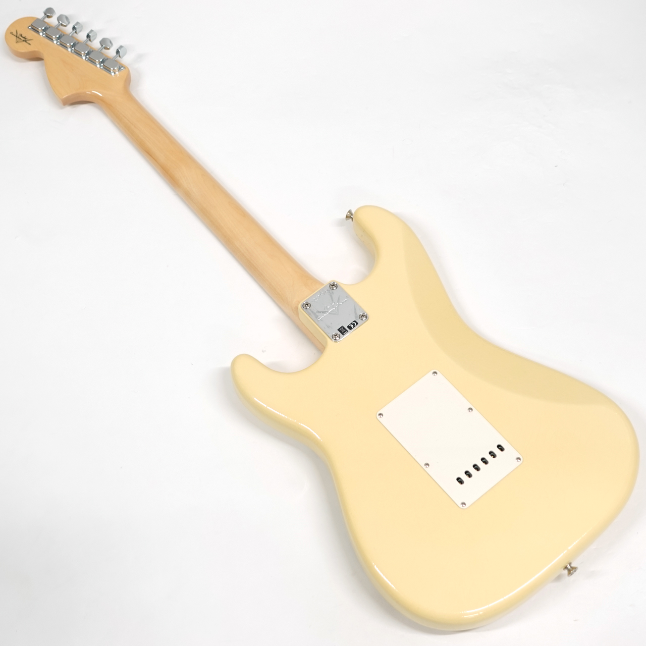 2ピースアルダーボディにメイプルネック、ラウンドボードのメイプル指板を採用、4点止めネックジョイントプレート、ラージヘッドにCBSロゴ、そして「WITH SYNCHRONIZED TRMOLO」の文字が入っているのが特徴的です。