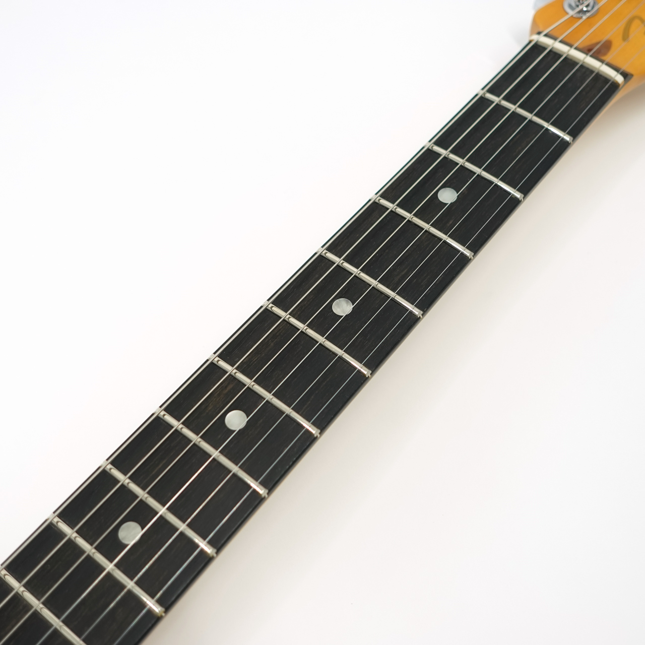 深めのボディコンターのアルダーボディ、エボニー指板、TUSQナット、コンパウンドラジアスにミディアムジャンボフレットで演奏性も良くハイポジションもスムーズに演奏出来ます。