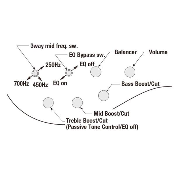 Ibanez Custom Electronics 3- band EQ w/EQ bypass switch & Mid frequency switch ワイド・レンジ&低ノイズのアクティブ・サ ウンドを生み出すイコライザーで、スイッ チの切り替えにより中音域の周波数帯を 250Hz、450Hz、700Hzに切り替えること が可能です。さらにEQバイパス・スイッチ を装備しており、パッシブ・ベースとして も使用可能です。 (バイパス時:Trebleノブでトーン・コン トロール)