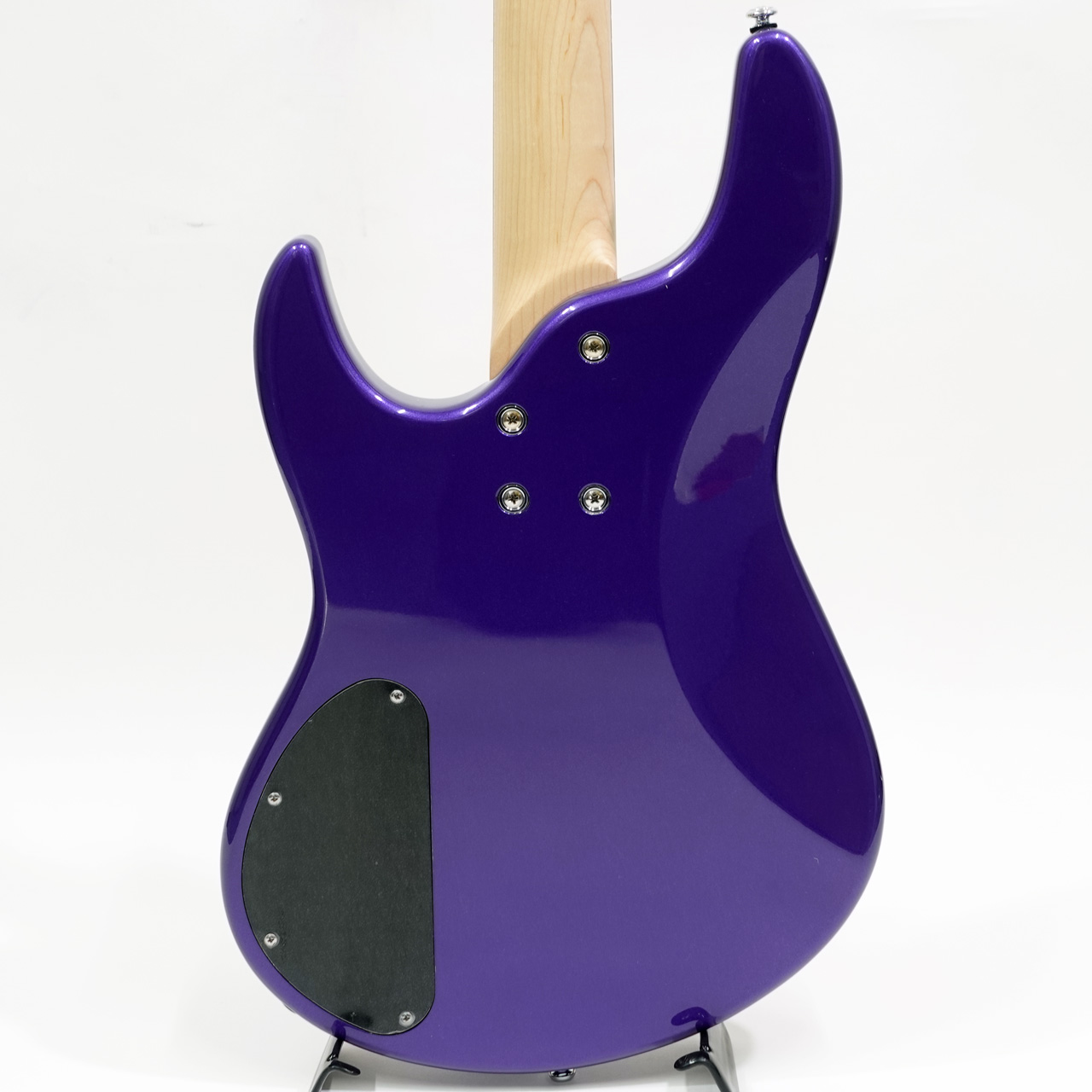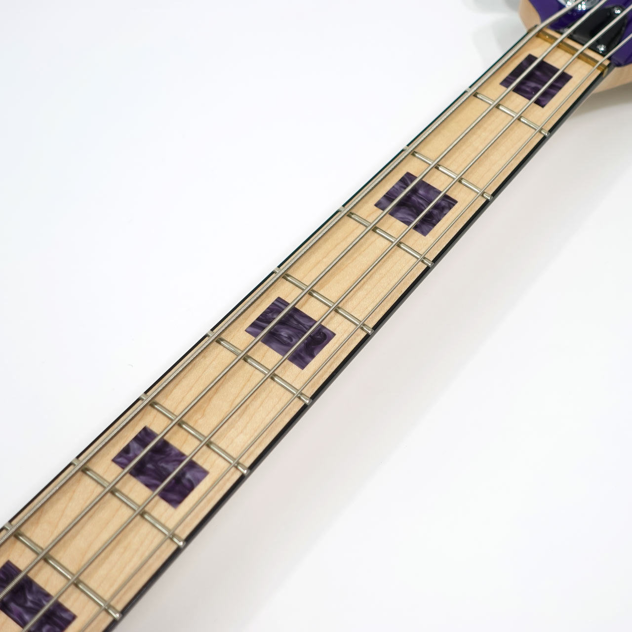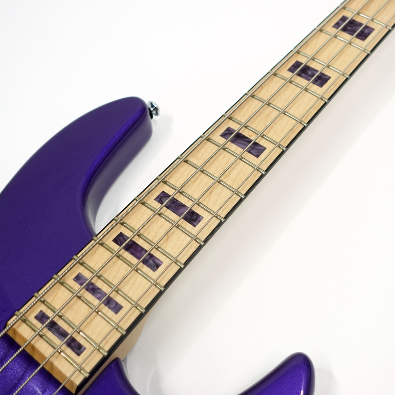 ヘッドストックも同色で統一され、パープルのアクリルブロックインレイが指板に映えます。