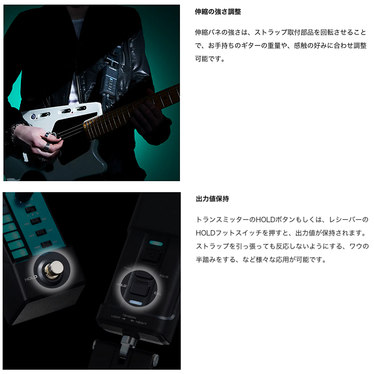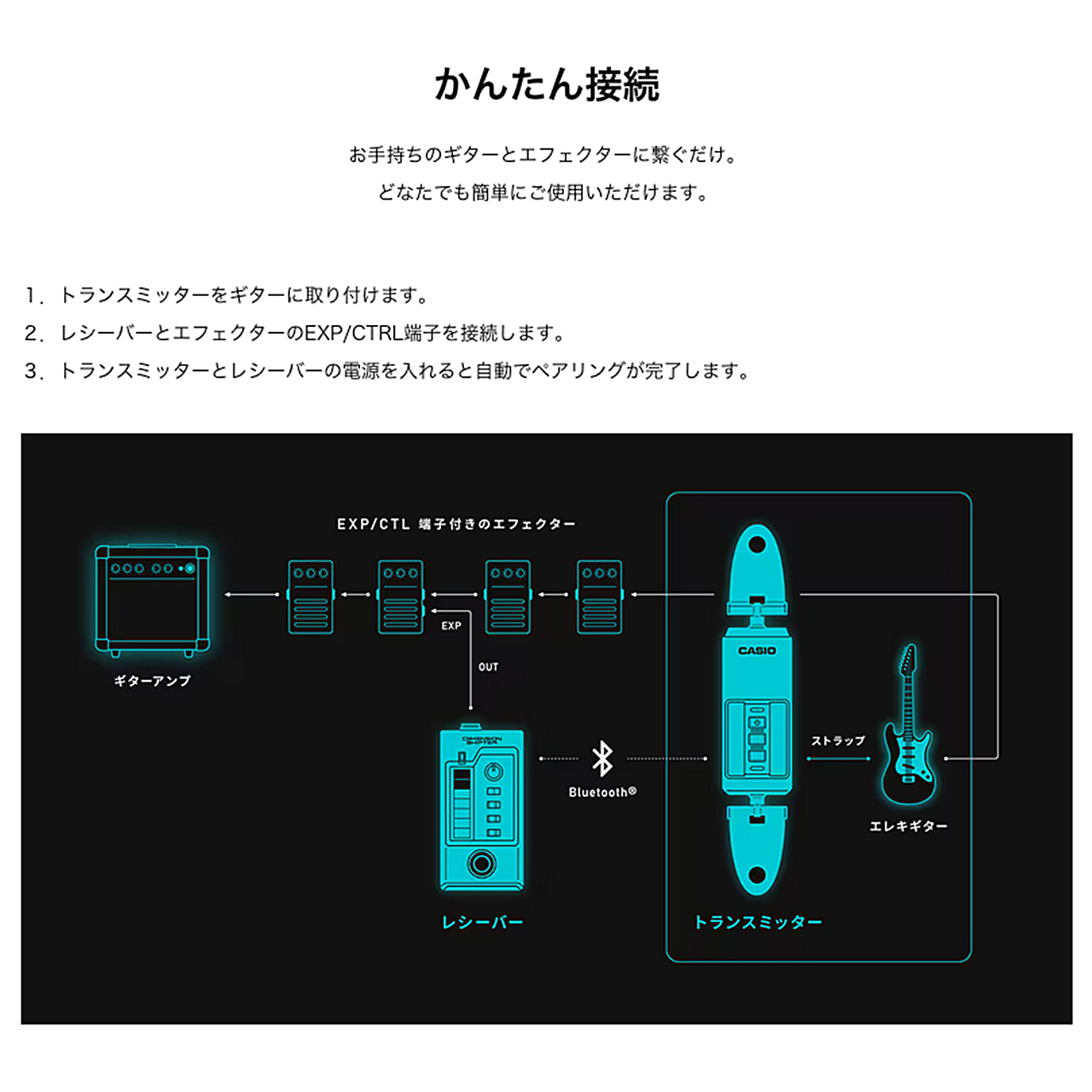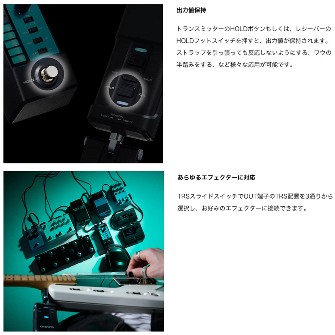 * 2026年1月カシオ調べ ギターネックを上下することでトランスミッターを操作し、お好みのエフェクターの出力値を変化させます。 これまでにない直感的な操作性で、より繊細に、想い通りの表現が可能に。エフェクターを「演奏」する新体験をお届けします。 PERFORMANCE