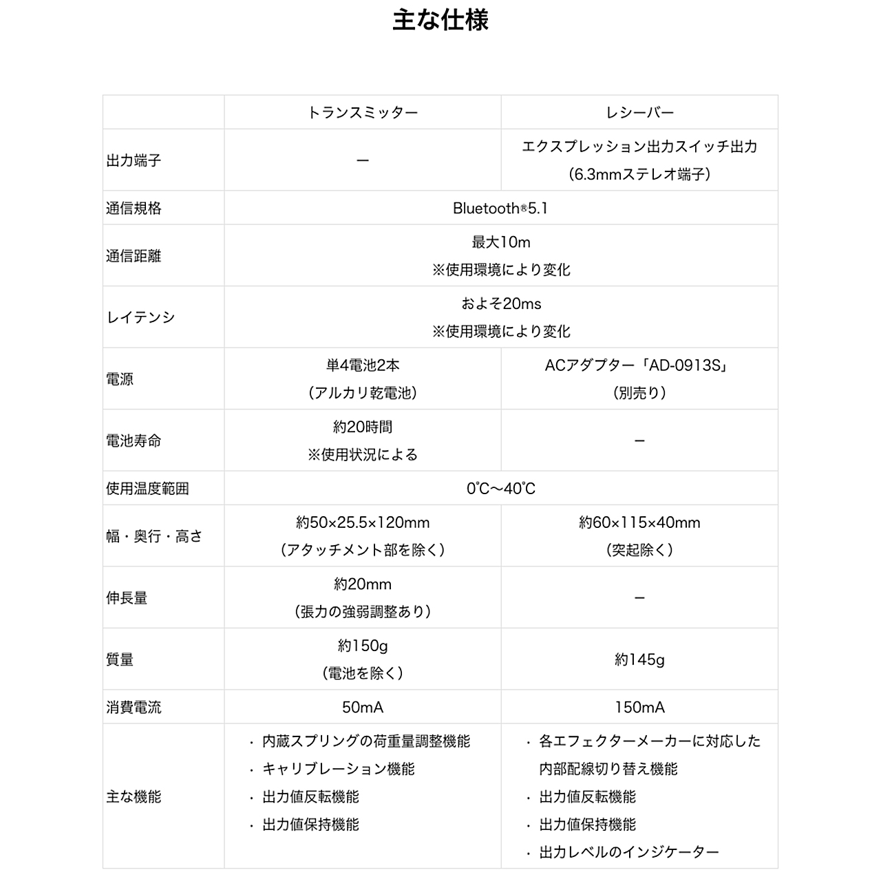お好みのエフェクターとEXペダルと組み合わせ、無限の可能性を追求します。 さまざまなエフェクターと組み合わせることで、あなただけの音作りが可能になります。 レシーバーのTRSスイッチ操作により、あらゆるメーカーのエフェクターに接続できます。 EXペダルと組み合わせれば、2つのエフェクトを同時にエクスプレッション操作することも可能です。 主な仕様