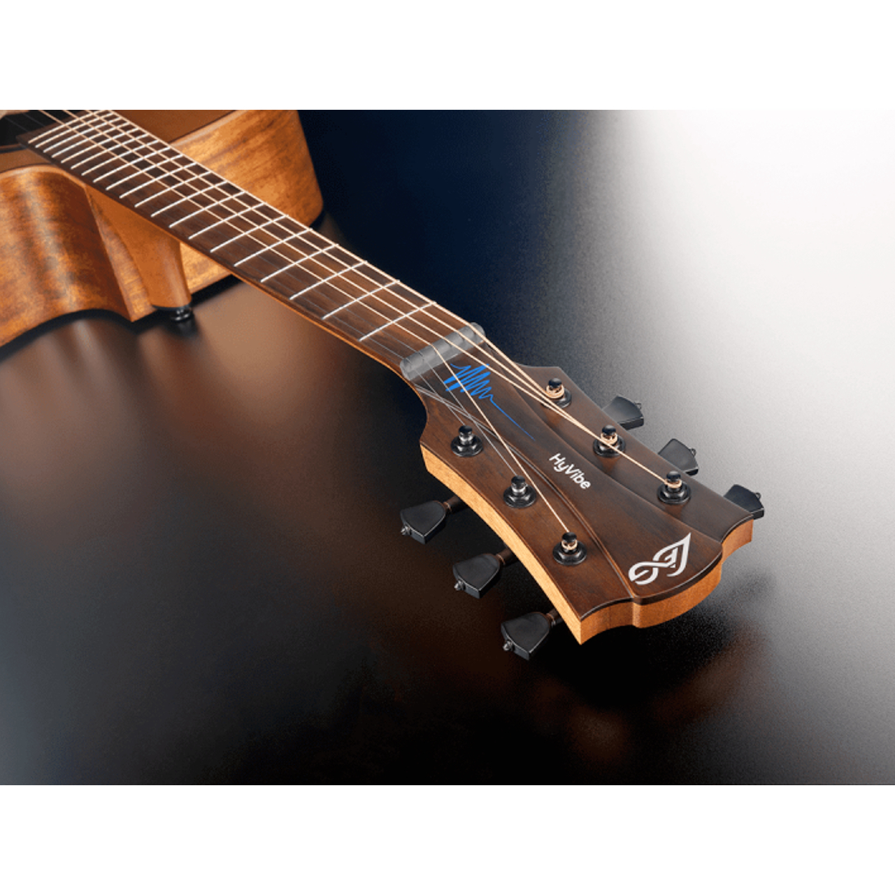 特筆すべきはHyVibe Systemというエレクトロニクスを搭載。ボディサイドに液晶コントローラーを搭載し、合わせて取り付けられたスピーカーから生音に直接リバーブやコーラス、ディレイからトレモロ、フェイザー、ディストーションなど多彩なエフェクトを使用可能。アンプやスピーカーが無くてもエフェクトありの演奏が可能です。さらにはルーパーやメトロノーム機能、もちろんチューナーも搭載。