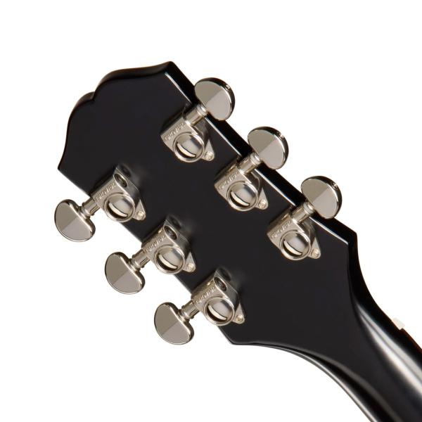 ボーンナット、サドル、グローバーのチューニングマシーン、マザーオブ・パールの指板インレイとヘッドロゴ、ピックガードもギブソン同様の形状を採用などスペック、ルックスとも一歩上の仕上がり。