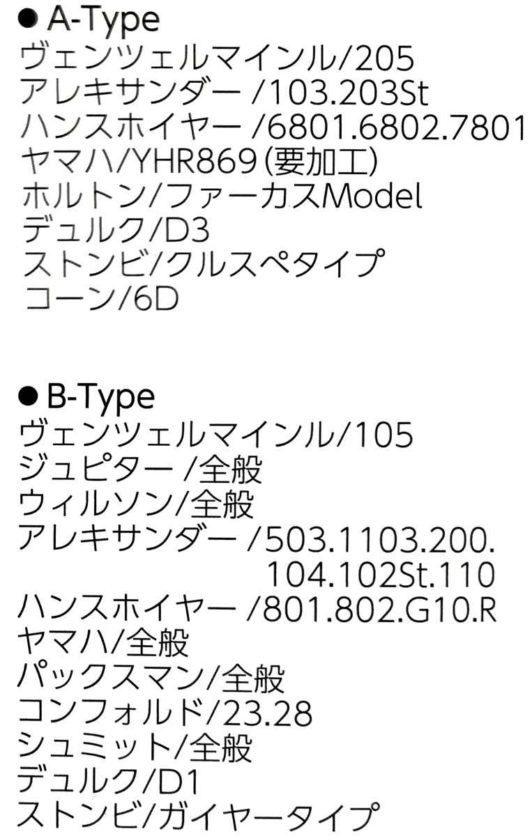 2タイプあり、リストの品番は要加工での対応可の製品が含まれています。よって、以下リストが全て各タイプに対応しているわけではございません。加工が必要であることが既に分かっているものは赤字で記していますが、それも全てではないとうことです。