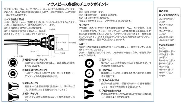 【モデル】【カップの深さ】【直径】【リム】【特徴】 No.7 M 33.25mm MW 大きなマウスピースで、豊かな生き生きとした音。低音域がすばらしい。強いアンブシュアの人に向く。Lボアの楽器に向く。 No.12 M 32.75mm MW 直径が大きく元気な音。 No.18 M 31.30mm MW ベストセラーのマウスピースで、多用途に使われる。 No.22 M 31.60mm MW No.18よりやや小さい。スクールバンドに向く。 No.24W M 31.25mm W 多用途に使え、生き生きとした音。スクールバンドに向く。 No.22AW D 31.25mm W 大きい音で、暗くよく響く、すばらしいマウスピース。 No.25 M 30.60mm MW やや小さいマウスピースで、若い学生に向く。 No.30E MS 30.00mm MW 小さいマウスピースで、息の量が少ない人に向く。若い学生や小さい口の人向け。 No.32E MS 29.50mm MW 小さいマウスピースで、軽量のバスホルンやパワーの少ない人で力強い音を望む人向け。