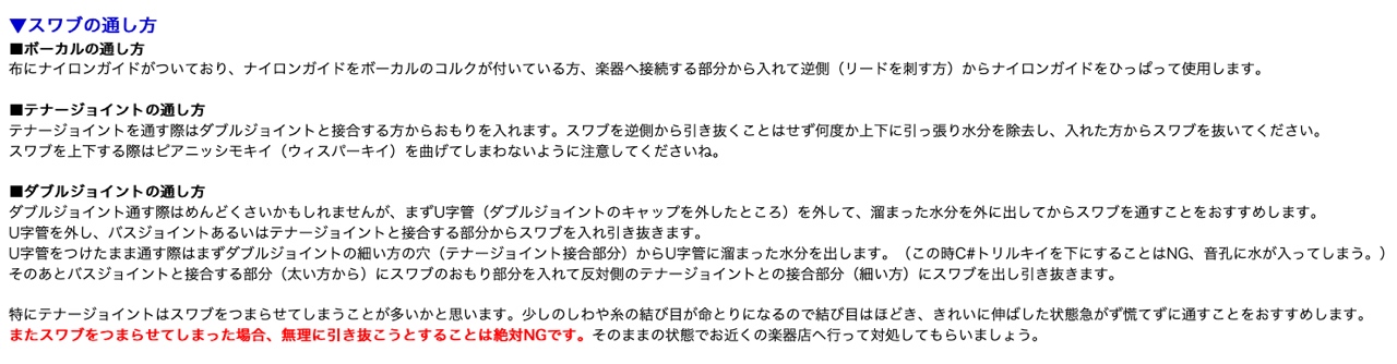特にテナージョイントはスワブをつまらせてしまうことが多いかと思います。少しのしわや糸の結び目が命とりになるので結び目はほどき、きれいに伸ばした状態急がず慌てずに通すことをおすすめします。 またスワブをつまらせてしまった場合、無理に引き抜こうとすることは絶対NGです。そのままの状態でお近くの楽器店へ行って対処してもらいましょう。
