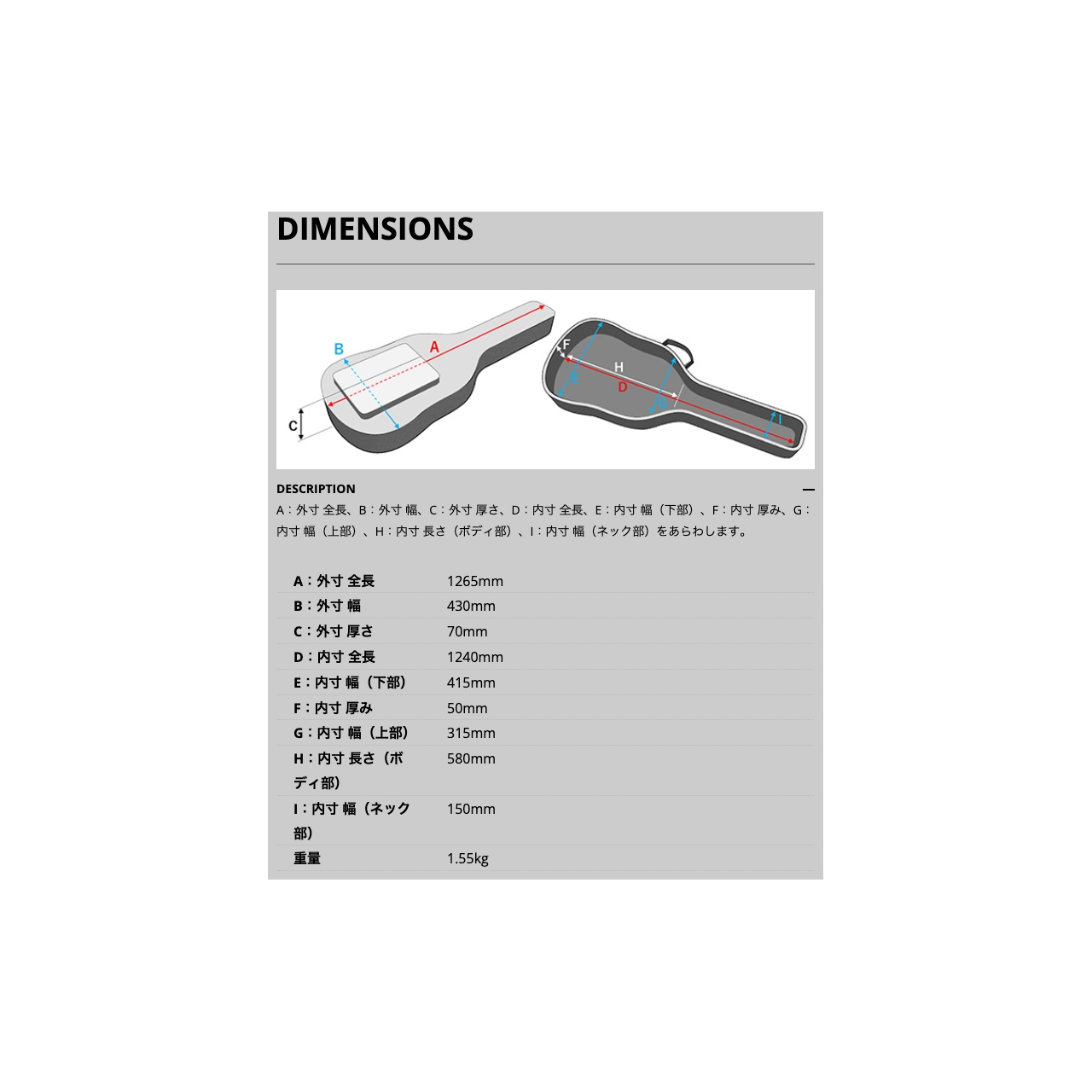 D:内寸 全長 1240mm E:内寸 幅(下部) 415mm F:内寸 厚み 50mm G:内寸 幅(上部) 315mm H:内寸 長さ(ボディ部) 580mm I:内寸 幅(ネック部) 150mm