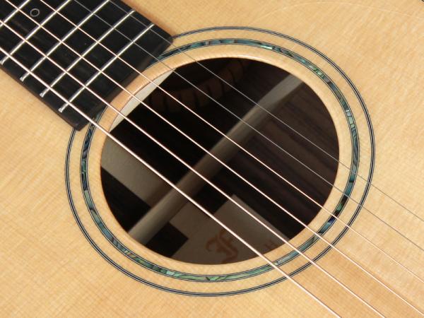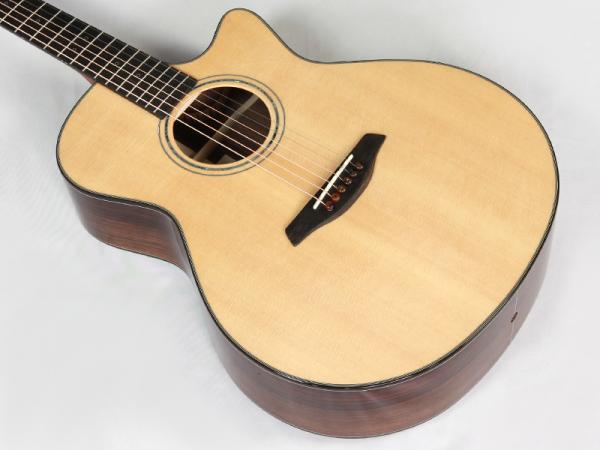 スプルースとローズウッドの王道の組み合わせによる、抜けの良い明るいクリアーな音色が魅力で、豊かな中低音と澄んだ高音が得られるモデルとなっております。音の分離感が非常に良く、程よく引き締まったローエンドから抜けの良い高音域までとてもバランス良く仕上がっております。