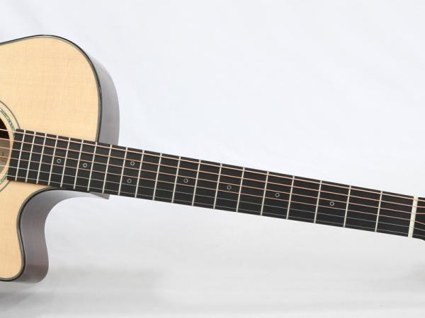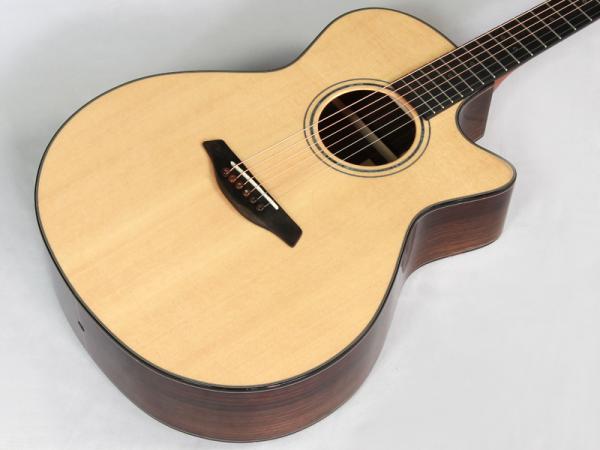 フォルヒ社は新たにシリーズを色の名でラインナップするようになりましたが、こちらのYellowは以前までの23シリーズとイコールとなるシリーズ。本器はグランドオーディトリアム・ボディにカッタウェイ、シトカスプルースとインドローズの組み合わせとなっており、フォルヒギターでもシダートップ仕様のGc-CRと人気を二分するモデルです。