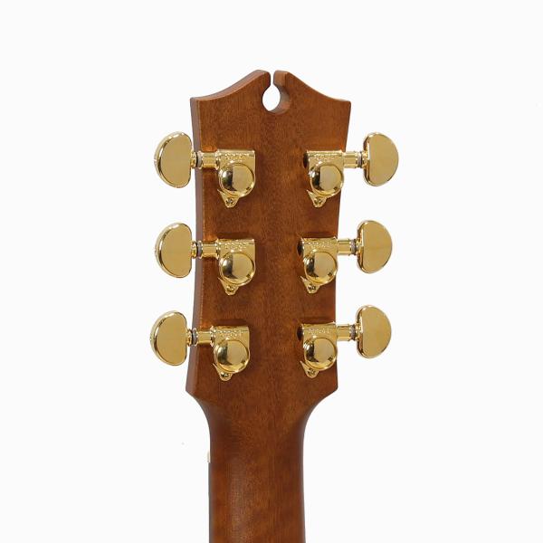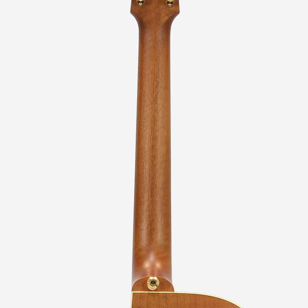 選りすぐられたクイーンズランド・メイプル材サイド&バックと、AAAグレードのシトカスプルース材トップの組み合わせで、 小振りなボディながら低域から高域まで驚くほど良く鳴ります。特に今回は当店で特別に個体を選定させて頂きましたので、杢目が非常に良い個体を入荷出来ました。このモデルは写真では見えにくいですがネックにカスタムショップ並みのバリ虎杢が出ております。またサイドバック材も美しいフレイムが出ており、非常に見応えのある個体となっております。