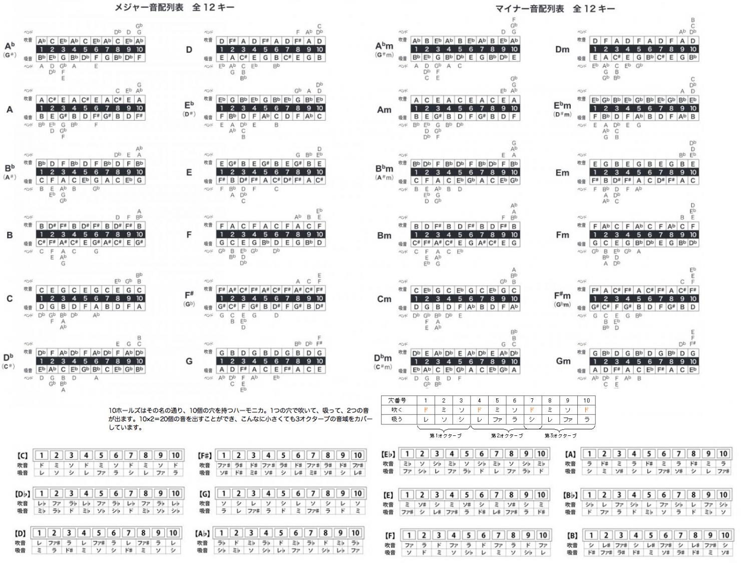 ハーモニカの豆知識世界でも最も愛用者が多く、ゆず、コブクロ、長渕剛、山崎まさよしなどの使用により若者にも大人気の10ホールズ(テンホールズ)。一番売れてる10穴ハープがホーナー社のブルースハープということから、ブルースハープという名前の方が一般的かもしれませんが、ブルースハープは商品名ですのでご注意を。幼稚園や小学校で童謡を吹いたハーモニカよりも小さく、また演奏方法も少し違います。ブルース音楽の象徴的な楽器であり、ロック、ニューミュージック、フォークのプレイヤーからも愛されています。 中央の4穴で完全に1オクターブをカバーし、上下の音階は和音演奏を考慮した配列になっています。演奏されたい曲のキーに合ったハーモニカを選ぶことから、残念ながら1本あれば全てOK!というわけではありません。メジャー(長調)とマイナー(短調)合わせて24本のハーモニカがいることになりますが、マイナーなどはあまり使用されませんし、必要によって揃えていくものですのでご安心下さい。まずは1本から。なんとなく始めてみたい方、何がなんだかさっぱり分からない方、プレゼントにちょっと...という方々にはC調がおすすめです。教室、教本などでも、最初に使用するのが多いのはC調ですので教本があれば一人ででもぼちぼちと練習できるのではないでしょうか。曲のキーと違うハーモニカを選ぶこともありますので演奏したい曲が決まっている方はよく調べてみましょう。10穴ハープは単音でメロディを楽しむことはもちろん、同時に3個の穴に息を入れることによって和音も演奏出来るのです。選ぶハーモニカを間違わなければアドリブでハーモニカを吹いても曲のキーから外れて音痴になる、といったこともないということですね。あとはこのハーモニカに魅力的なベンド奏法です。ベンドは簡単にいうと音を下げる奏法のことで、少しコツが要りますがこれを取り入れることで独特のニュアンスが表現できます。 ■【樹脂(プラスティック)ボディ】...安くて初心者向けです。気密性が高いので、息を入れた時の音の立ち上がりが早く、演奏がしやすく感じられます。硬めの音で音量も大きいです。頑丈で手入れにもさほど気を遣わないとこも良いですね。 ■【木製ボディ】...息の入れ方が少し難しいと言われていますが出た音はとてもキレイです。木製であることから水分を木が吸収し、なじむまで少し時間がかかります。そのため樹脂製と比べ音の立ち上がりが遅く感じられます。樹脂製は本体に水分が吸収されることはないですが木は水分を含み膨張してしまうことがありますのでお手入れをして大事にして下さい。 以上のような事はブルースハーモニカの教本で紹介されています。ハーモニカの教本の中では一番種類も多く、お近くの本屋さんでも教本は手に入るかもしれません。今はインターネットで少し調べれば出てくる情報もありますので、分からないことがあれば調べて見て下さいね。その他、ご不明な点やご要望などがございましたらお気軽にメールでお問い合わせ下さい。