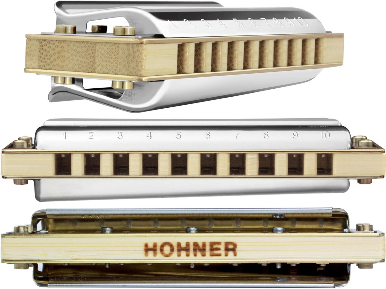 世界でも最も愛用者が多く、ゆず、コブクロ、長渕剛、山崎まさよしなどの使用により若者にも大人気の10ホールズ(テンホールズ)。一番売れてる10穴ハープがホーナー社のブルースハープということから、ブルースハープという名前の方が一般的かもしれませんが、ブルースハープは商品名ですのでご注意を。幼稚園や小学校で童謡を吹いたハーモニカよりも小さく、また演奏方法も少し違います。ブルース音楽の象徴的な楽器であり、ロック、ニューミュージック、フォークのプレイヤーからも愛されています。 中央の4穴で完全に1オクターブをカバーし、上下の音階は和音演奏を考慮した配列になっています。演奏されたい曲のキーに合ったハーモニカを選ぶことから、残念ながら1本あれば全てOK!というわけではありません。メジャー(長調)とマイナー(短調)合わせて24本のハーモニカがいることになりますが、マイナーなどはあまり使用されませんし、必要によって揃えていくものですのでご安心下さい。まずは1本から。なんとなく始めてみたい方、何がなんだかさっぱり分からない方、プレゼントにちょっと...という方々にはC調がおすすめです。教室、教本などでも、最初に使用するのが多いのはC調ですので教本があれば一人ででもぼちぼちと練習できるのではないでしょうか。曲のキーと違うハーモニカを選ぶこともありますので演奏したい曲が決まっている方はよく調べてみましょう。10穴ハープは単音でメロディを楽しむことはもちろん、同時に3個の穴に息を入れることによって和音も演奏出来るのです。選ぶハーモニカを間違わなければアドリブでハーモニカを吹いても曲のキーから外れて音痴になる、といったこともないということですね。あとはこのハーモニカに魅力的なベンド奏法です。ベンドは簡単にいうと音を下げる奏法のことで、少しコツが要りますがこれを取り入れることで独特のニュアンスが表現できます。