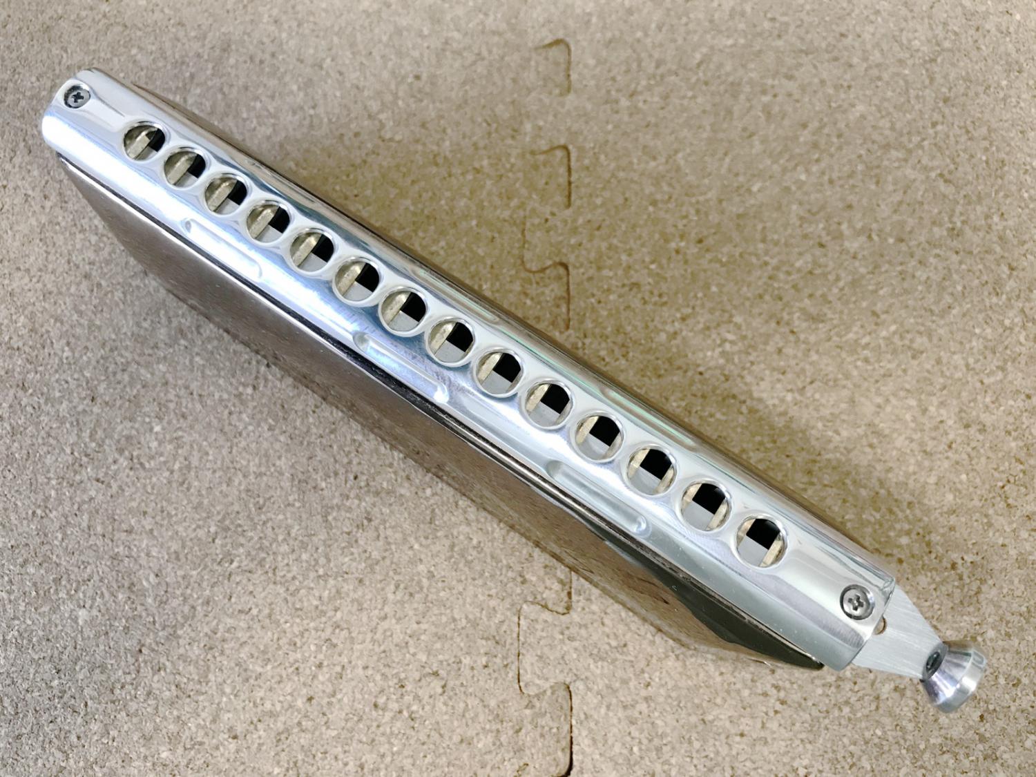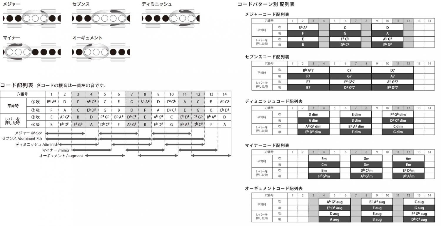 クロマチック&10ホール奏者の私にとって、食指が動くコードハーモニカが誕生した!手のひらサイズに全てのメジャー、マイナー、ディミニッ シュ、オーギュメントを搭載。代理コードを使いこなせれば幅はさらに広がる。こいつがあればいつでもどこでもジャズセッションが出来る!ブルース を覚えたらAll Of Me、Autumn Leavesあたり、そしてAll The Things You Areなんか吹けたら最高だね!