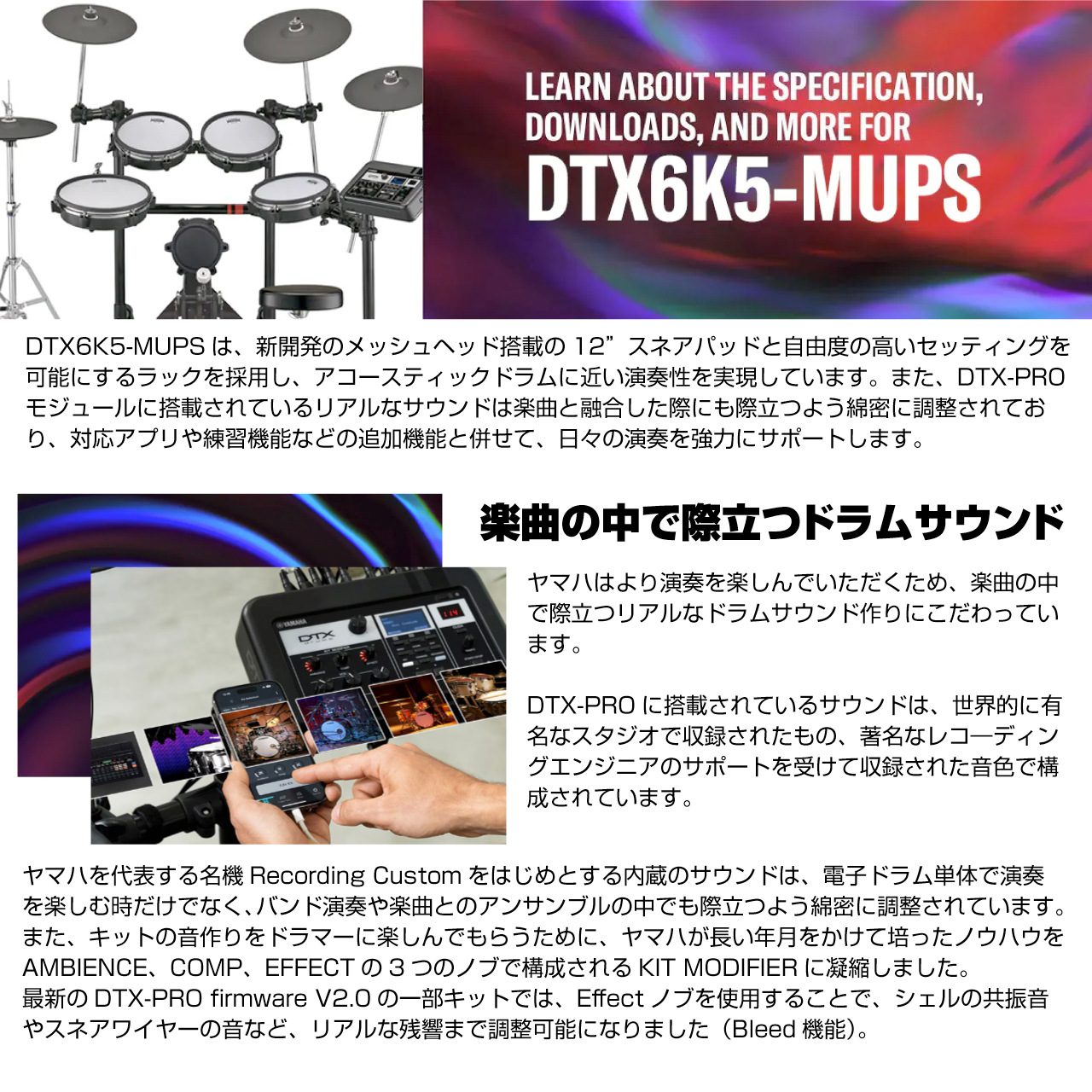 DTX6K5-MUPSは、新開発のメッシュヘッド搭載の12”スネアパッドと自由度の高いセッティングを可能にするラックを採用し、アコースティックドラムに近い演奏性を実現しています。また、DTX-PROモジュールに搭載されているリアルなサウンドは楽曲と融合した際にも際立つよう綿密に調整されており、対応アプリや練習機能などの追加機能と併せて、日々の演奏を強力にサポートします。