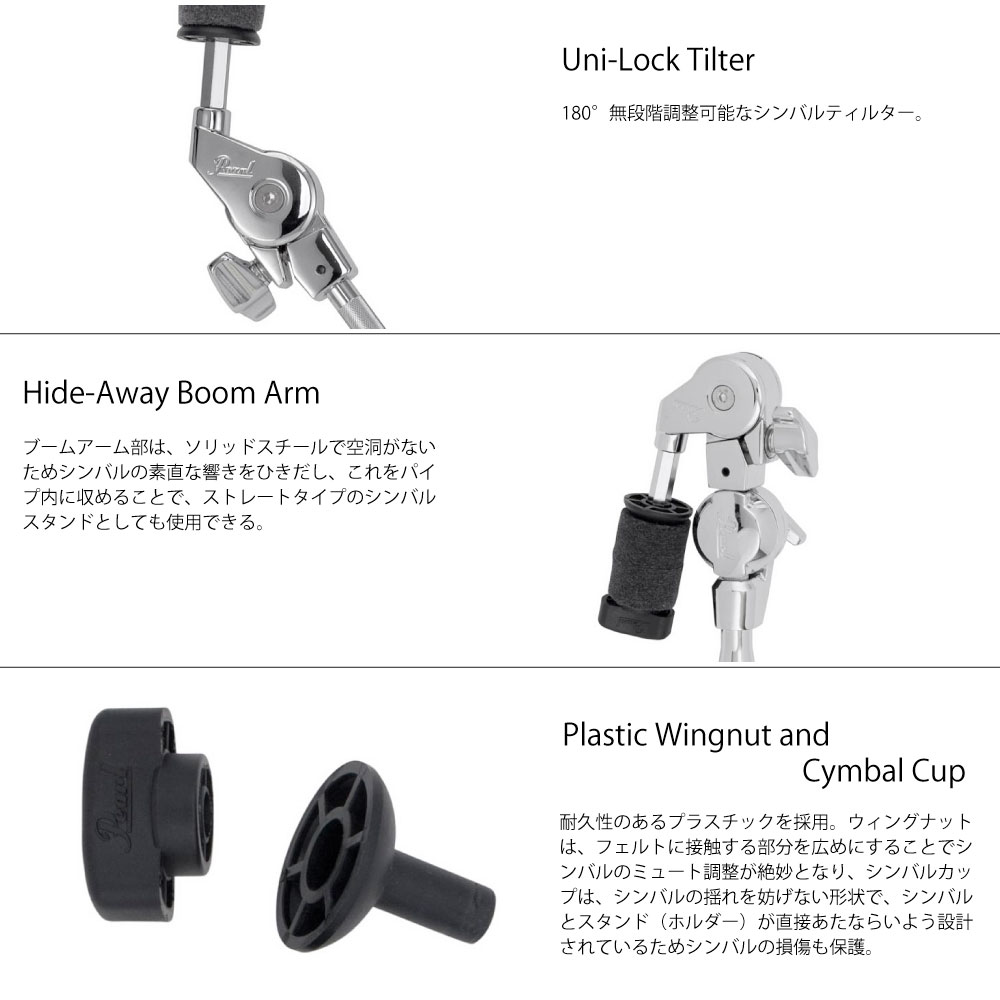 ビギナーからプロフェッショナルまで、幅広い層に対応するシンバルホルダー。ブームアームをパイプ内に収納することでストレートタイプにすることもできるシンバルホルダー。180°無段階で固定できるユニロック・ティルターを採用することで、ギア式では不可能なシンバルの微妙な角度調整が可能。
