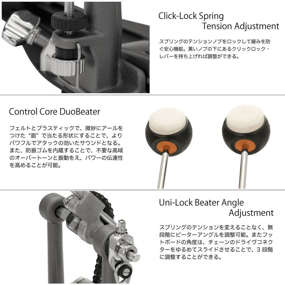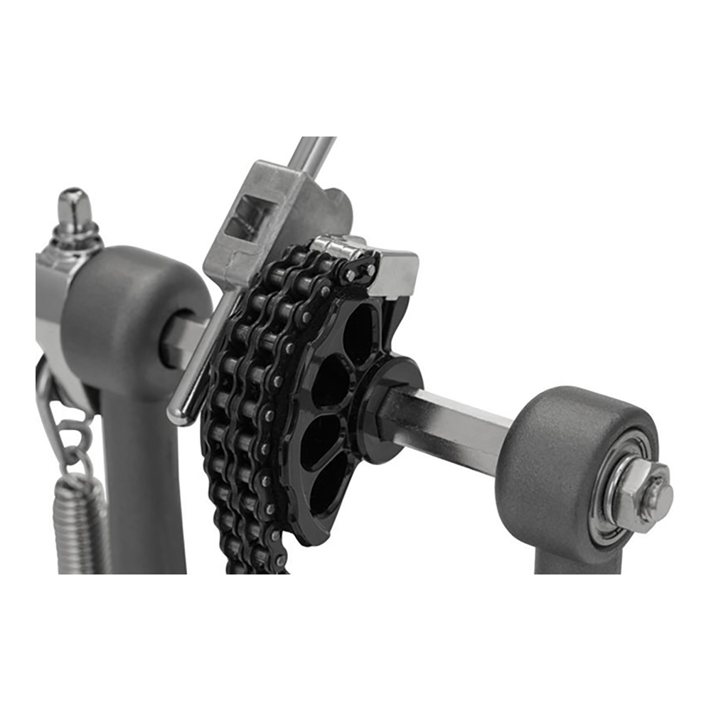 “Eliminator: Redline Chain Drive”ドラムペダルのYoung Brother。クリックロック・スプリングテンション調整機能、パワーシフター、ローラー・フープクランプ・システムなどの機能はそのままに、“Redline”ドラムペダルで国内一番人気のブラックカムと同サイズの真円ホイールを採用したモデル。フラットコンセプトでシンプルデザインのフットボードは、ニュートラルな状態でのフットワークが可能で、コストパフォーマンに優れているのも魅力。