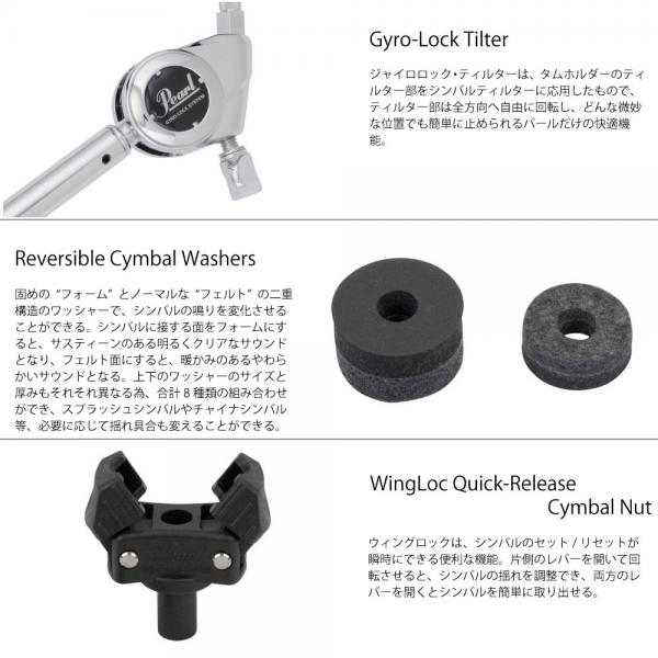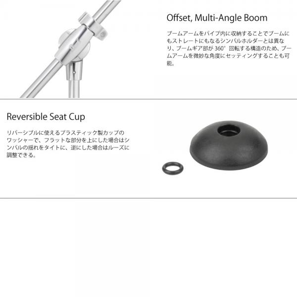耐久性が高く扱いやすいプロフェッショナル仕様のシンバルホルダー。ブームアームをパイプ内に収納することでブームにもストレートにもなるシンバルホルダーとは異なり、ブームギア部が360°回転するため、ブームアームを微妙な角度にセッティングすることも可能。また、自由な角度にシンバルをセットできる全方向回転型のジャイロロック・ティルター、シンバルのセット/リセットが瞬時におこなえるウィングロック、シンバルの鳴りを変化させることのできるフォーム/フェルトワッシャーなど、質の高い技術が様々な箇所に散りばめられている。