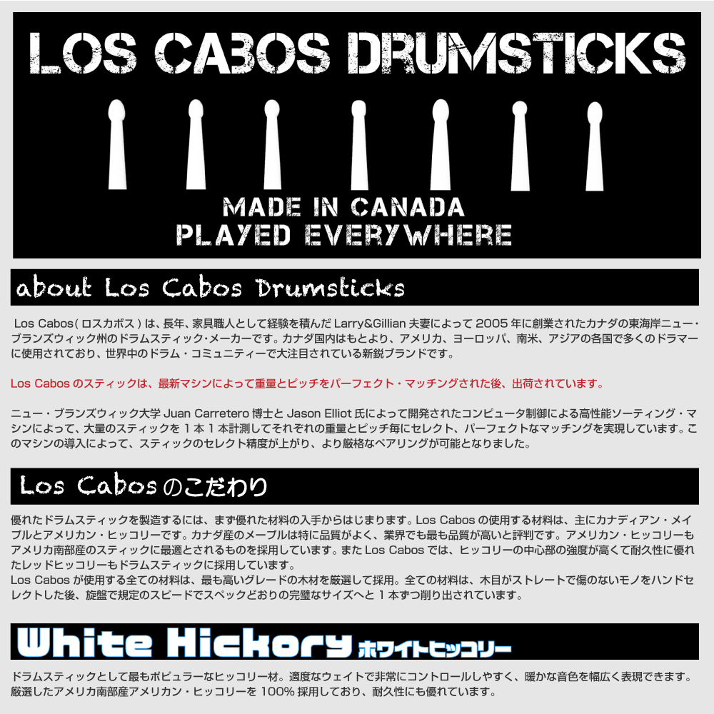 Los Cabos(ロスカボス)は、長年、家具職人として経験を積んだLarry&Gillian夫妻によって2005年に創業されたカナダの東海岸ニュー・ブランズウィック州のドラムスティック・メーカーです。 カナダ国内はもとより、アメリカ、ヨーロッパ、南米、アジアの各国で多くのドラマーに使用されており、 世界中のドラム・コミュニティーで大注目されている新鋭ブランドです。