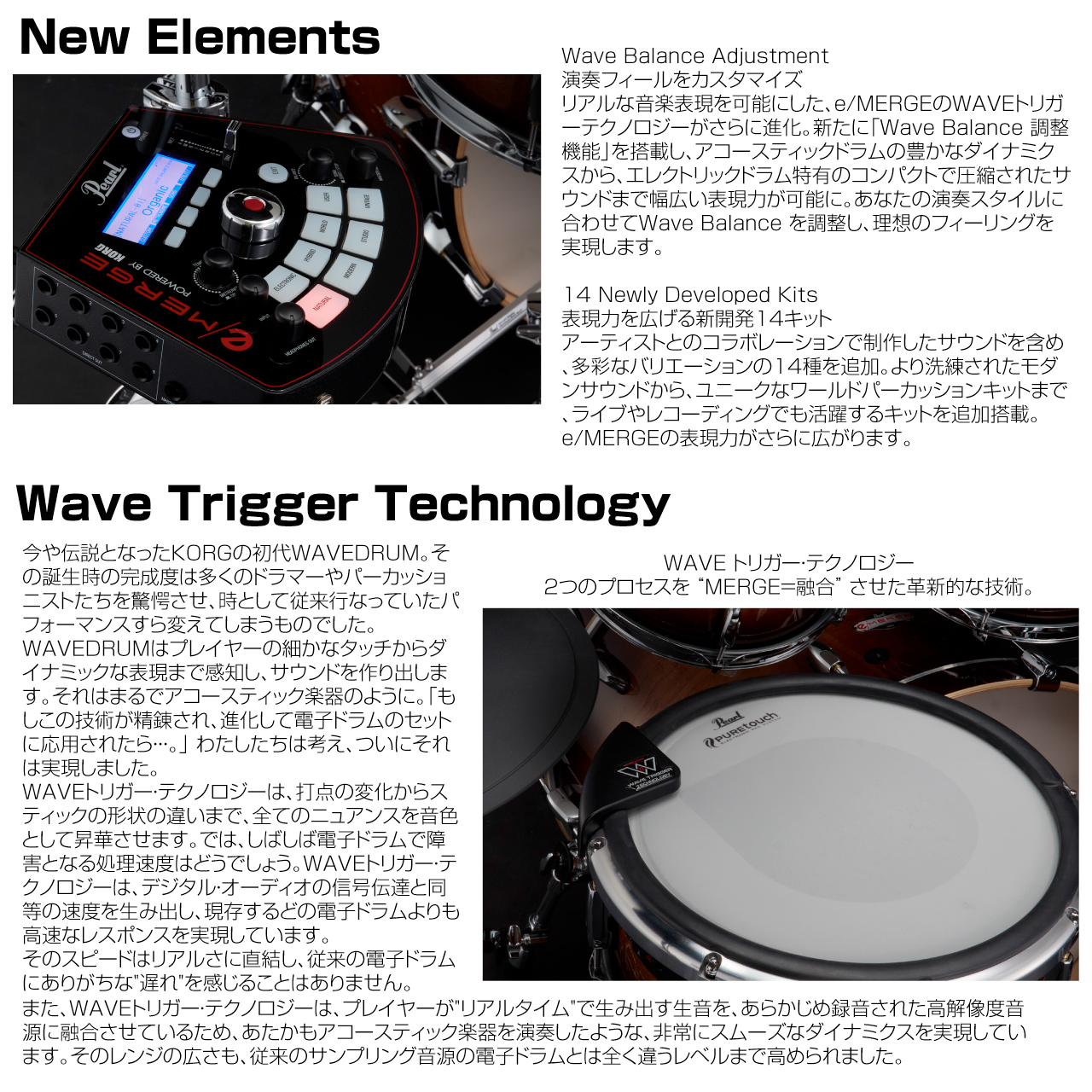 音色のリアルさ、高速レスポンス、広いダイナミックレンジを再現するWAVEトリガー・テクノロジーや、ドラマーにとって最良な打感となる構造を採用したPUREtouchパッド・システムはそのままに、アーティストと共同制作をしたサウンドを含めた、バリエーション豊かな14種キットを新たに追加。より洗礼されたモダンサウンドに加え、ユニークなワールドパーカッションキットまで、ライブやレコーディングでも活躍するキットを搭載し、e/MERGEの表現力がさらに広がります。バーチ材を使用したタム/フロアタム、バスドラム、スネアドラムには、高級感あふれるラッカー仕上げが施され、アコースティックドラムで培った卓越した技術と、KORGの先進的な電子技術が融合したドラムキットを提供します。さらにMDL1モジュールに新機能「Wave Balance Adjustment」を搭載。これにより、自身のユーザーキットでベストな表現方法の設定が可能。