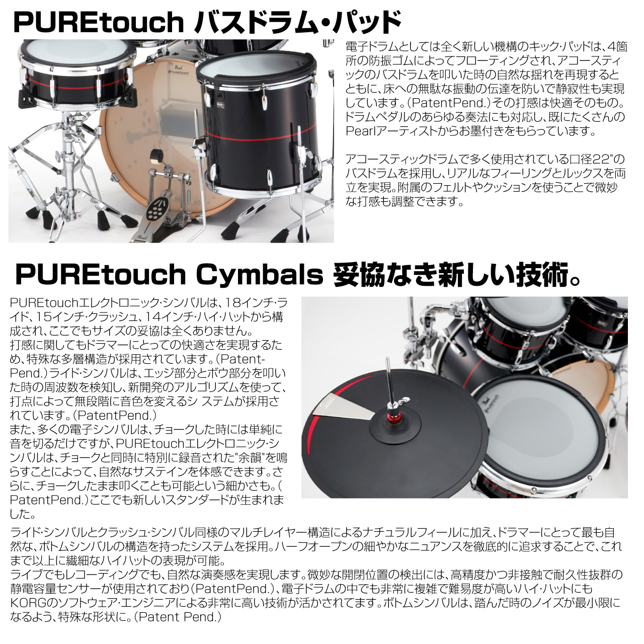 アコースティック・ドラムやシンバルを彷彿とさせるPUREtouchパッド・システムの打感は多層構造から導き出され、ドラマーがストレスなく演奏に集中できます。リアルなサイズ感も加わって、その演奏性はかつてない未体験の領域