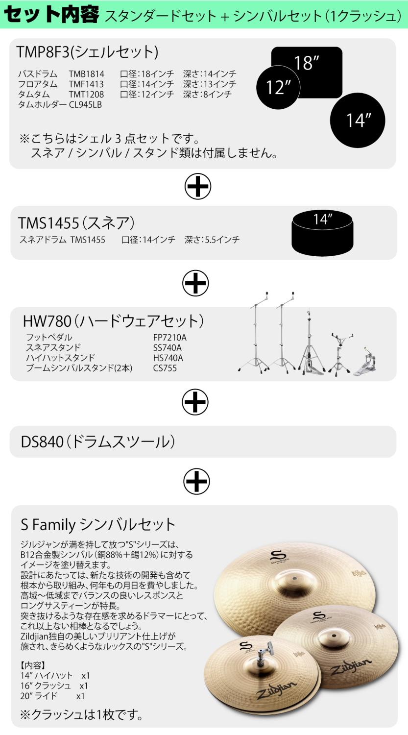 ■商品名  : Tour Custom TMP8F3SSTD CAS キャンディーアップルサテン スタンダードセット Sシリーズ 2シンバル