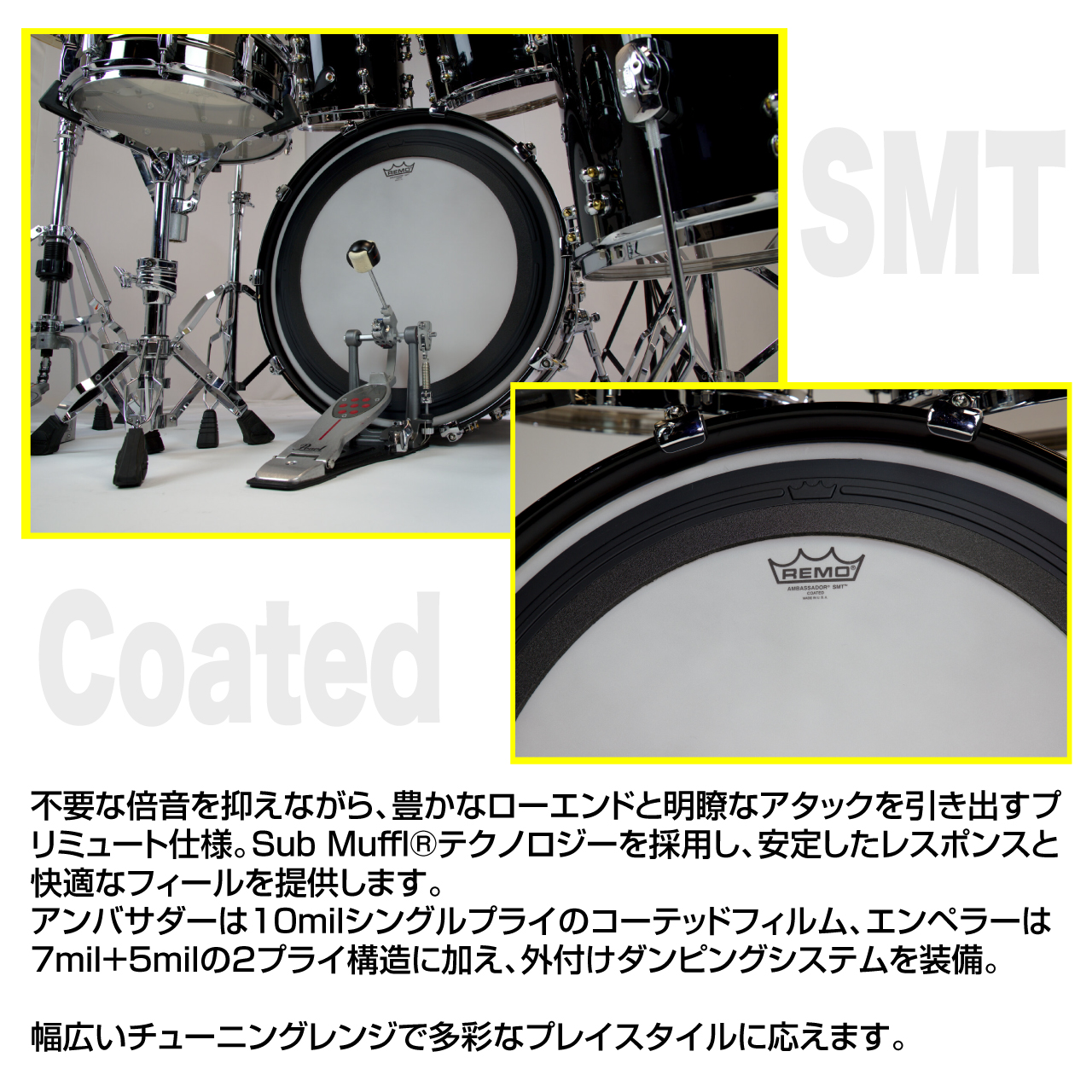SMT COATED Ambassador 20インチバスドラ用不要な倍音を抑えながら、豊かなローエンドと明瞭なアタックを引き出すプリミュート仕様。 Sub Mufflテクノロジーを採用し、安定したレスポンスと快適なフィールを提供します。 アンバサダーは10milシングルプライのコーテッドフィルム、エンペラーは7mil+5milの2プライ構造に加え、外付けダンピングシステムを装備。 幅広いチューニングレンジで多彩なプレイスタイルに応えます。