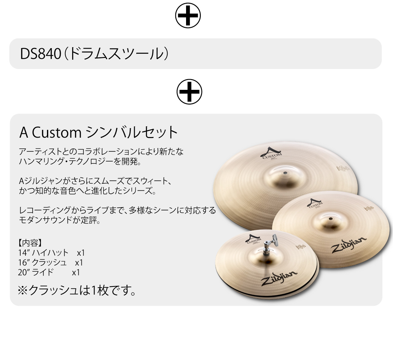 こちらはA Custom シンバルセットです!(2シンバル仕様/クラッシュ1枚とライドが1枚です。)