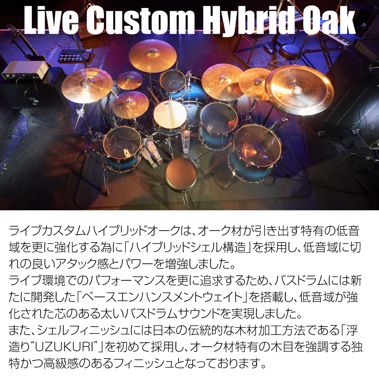 Live Custom Hybrid Oakライブカスタムハイブリッドオークは、オーク材が引き出す特有の低音域を更に強化する為に「ハイブリッドシェル構造」を採用し、低音域に切れの良いアタック感とパワーを増強しました。ライブ環境でのパフォーマンスを更に追求するため、バスドラムには新たに開発した「ベースエンハンスメントウェイト」を搭載し、低音域が強化された芯のある太いバスドラムサウンドを実現しました。また、シェルフィニッシュには日本の伝統的な木材加工方法である「浮造り“UZUKURI”」を初めて採用し、オーク材特有の木目を強調する独特かつ高級感のあるフィニッシュとなっております。