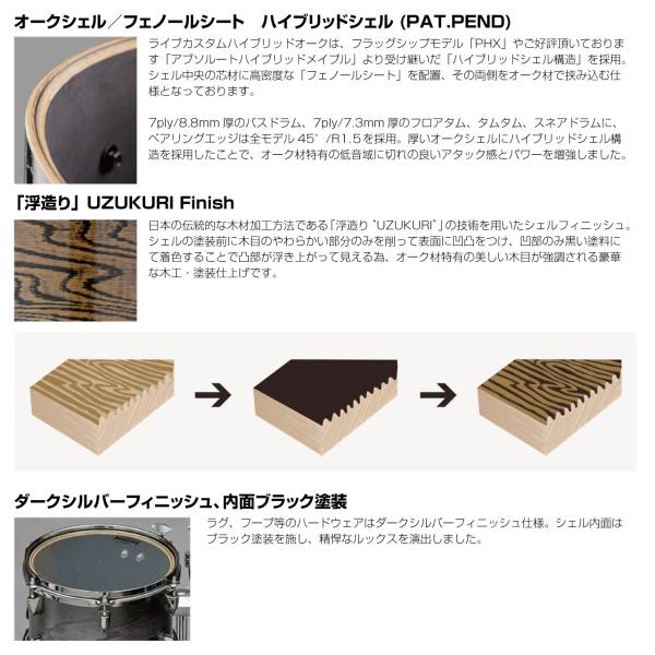 ライブカスタムハイブリッドオークは、フラッグシップモデル「PHX」やご好評頂いております「アブソルートハイブリッドメイプル」より受け継いだ「ハイブリッドシェル構造」を採用。シェル中央の芯材に高密度な「フェノールシート」を配置、その両側をオーク材で挟み込む仕様となっております。