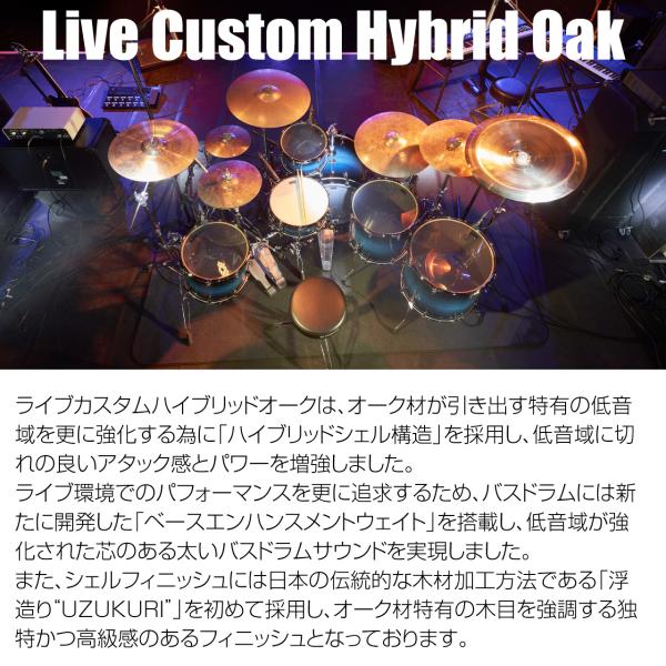 ライブカスタムハイブリッドオークは、オーク材が引き出す特有の低音域を更に強化する為に「ハイブリッドシェル構造」を採用し、低音域に切れの良いアタック感とパワーを増強しました。ライブ環境でのパフォーマンスを更に追求するため、バスドラムには新たに開発した「ベースエンハンスメントウェイト」を搭載し、低音域が強化された芯のある太いバスドラムサウンドを実現しました。また、シェルフィニッシュには日本の伝統的な木材加工方法である「浮造り“UZUKURI”」を初めて採用し、オーク材特有の木目を強調する独特かつ高級感のあるフィニッシュとなっております。