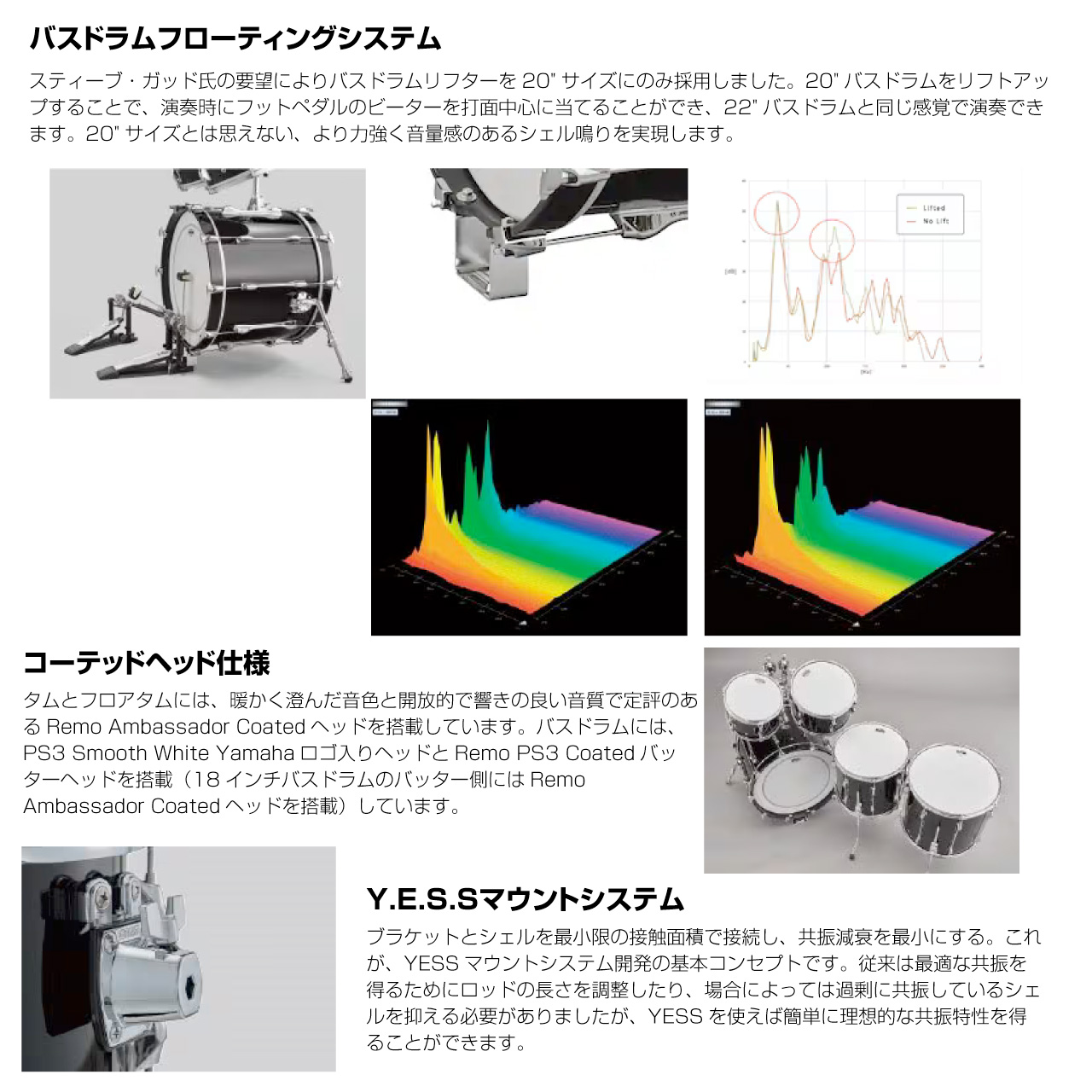 バスドラムには、PS3 Smooth White Yamahaロゴ入りヘッドとRemo PS3 Coatedバッターヘッドを搭載(18インチバスドラムのバッター側にはRemo Ambassador Coatedヘッドを搭載)しています。