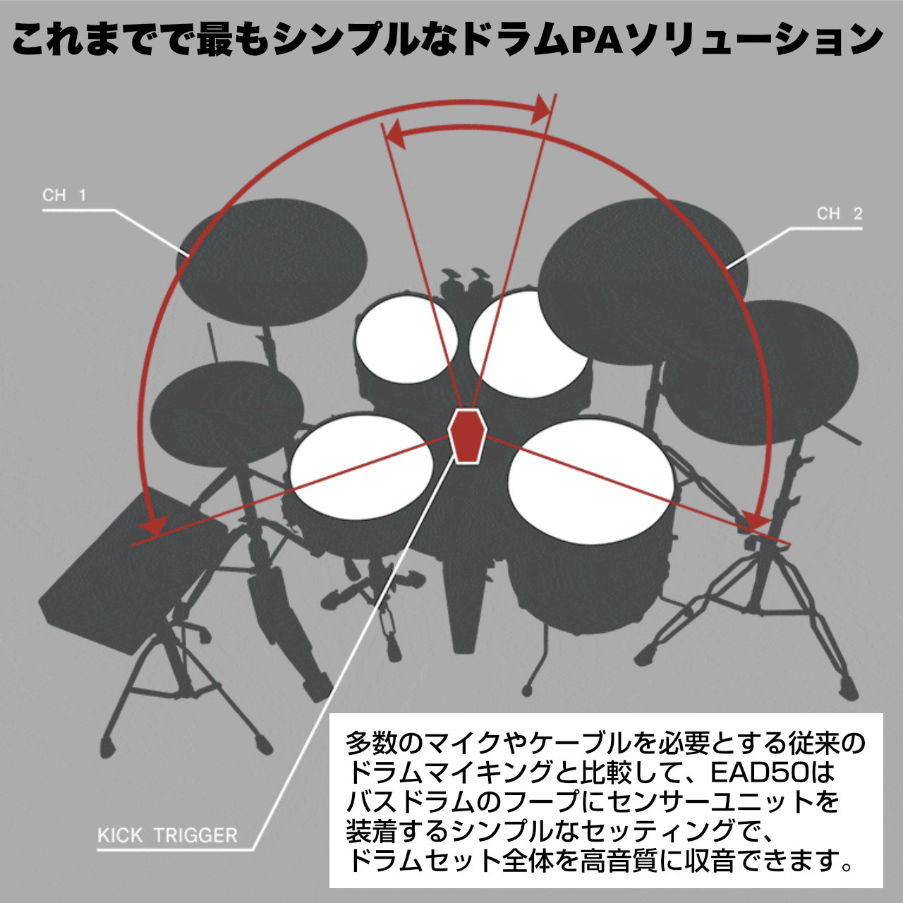 EAD50はこれまでのドラマーの悩みを解決する、最もシンプルでスマートなドラムPAソリューションです。