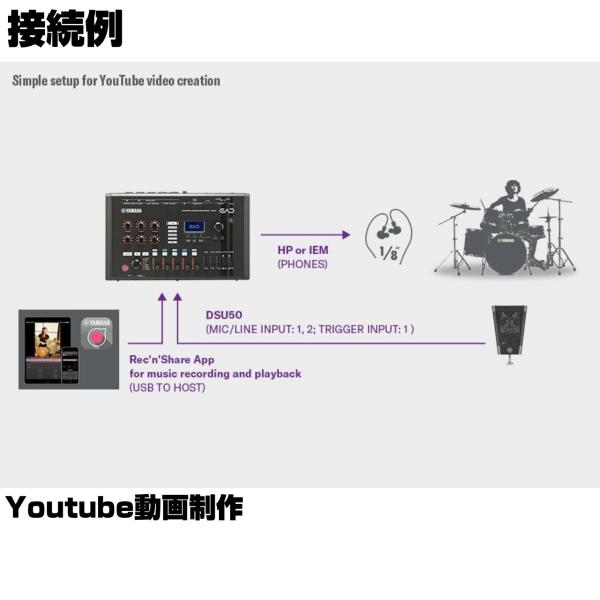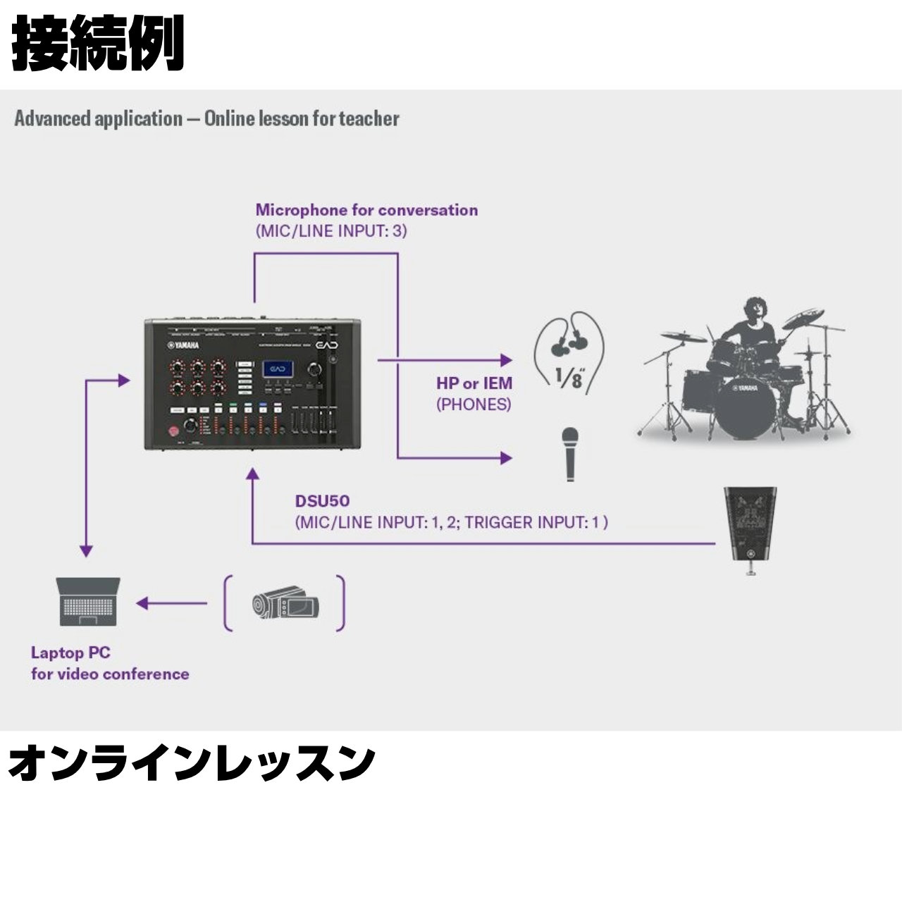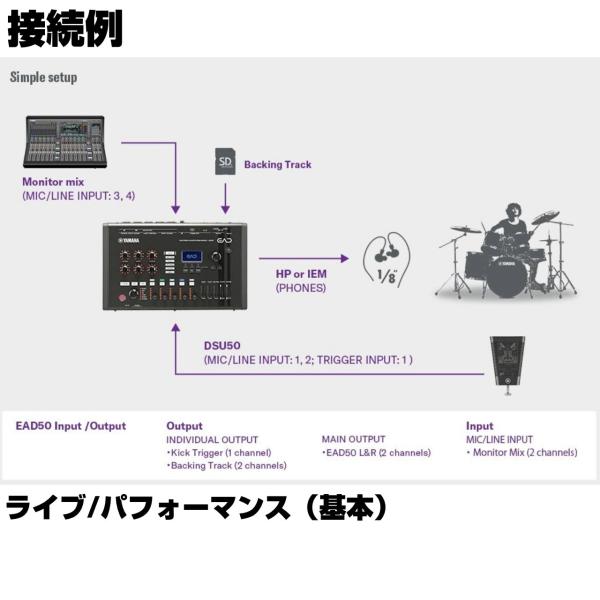 また、USBメモリーやSDカードからバッキングトラックを再生し、クリック音のみをドラマーに送ることもできます。この機能により、ドラム単独でのパフォーマンスやクリニック、セミナーなどのシーンでも、EAD50は高いパフォーマンスを発揮します。