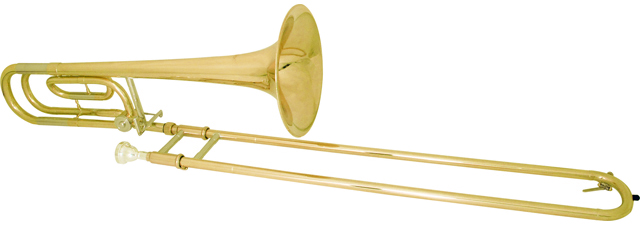 上記テナートロンボーンに、主にF管を取り付けたものです。テナーはB♭管ですが、レバーでF管に切り替えられます。これによって低音域が拡大し、遠くに腕を伸ばさなくても同じ音程が出るしくみです。操作性が向上しますので早いパッセの曲を演奏する場合や体格や経験によってこちらを選ぶ場合があります。ただし、管が増えますので楽器が重くなります。