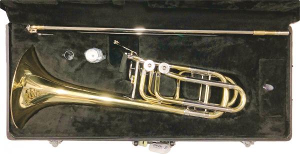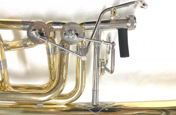 テナーバスと同じロータリーが1つしかない楽器です。ただテナーバストロンボーン と違いベルサイズが大きく 、ボアサイズ (管の内径)が太くなっていてより豊かな低音が出せます。ダブルロータリーより価格は安いです。 低音域の拡大のためにF管の他にもう1つ迂回管があるのでロータリーが2つついています。それに加えベルサイズが大きく 、ボアサイズ (管の内径)が太くなっています。バルブ配置が2種類あり、それによって使える調子が3種類、または4種類かどうか決まります。F管の他にもう1つ迂回管は基本的にはG♭管になりますが、G管のものもあります。G♭管の場合、2つのバルブを使用した際にはD管になり、G管の場合はE♭管になります。