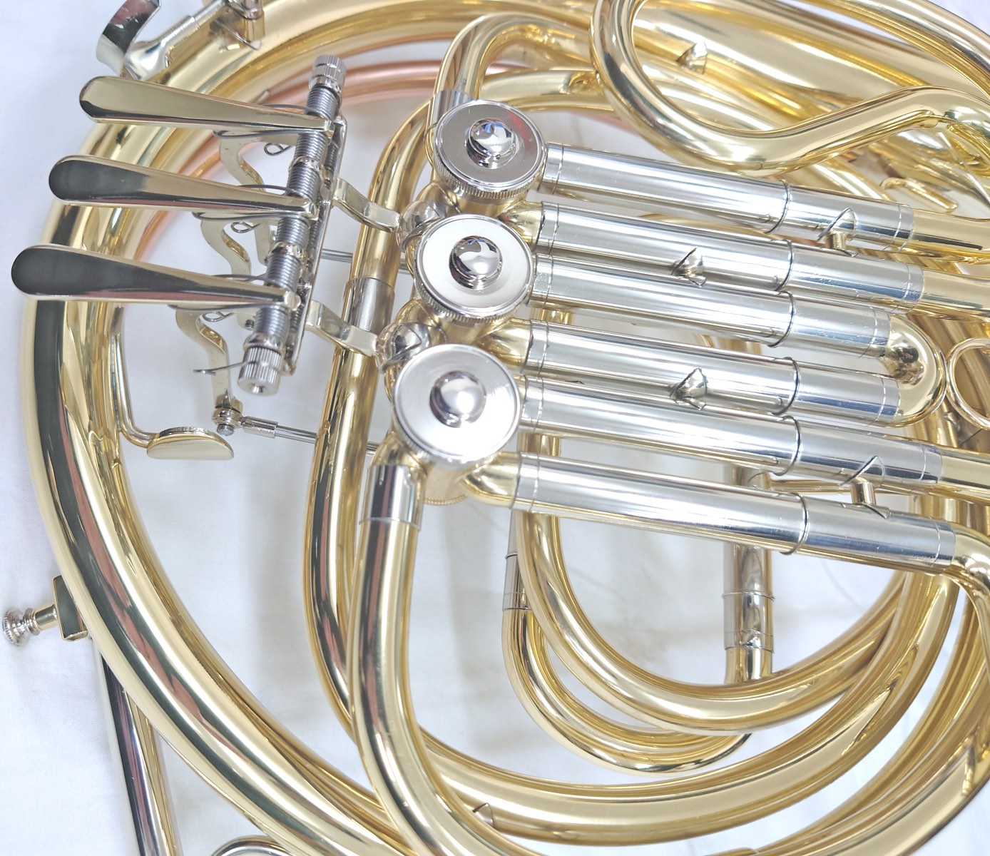 上記2つの調の管が1つになった楽器です。F管とB♭管の組み合わせが一般的で入門者でも先のことを考えこちらから使用することもあります。それぞれ独立した2つの調性をバルブで切り替えることができます。シングルに比較して音程、音色、正確性、パワーなどをレバーひとつで切り替えることで臨機応変に使い分けが出来るのですが操作性が良いということはそれだけ使用する管もパーツも多くなりますので、重さがあります。フルダブルが多く使われますが、「セミダブル」というものも存在します。同じ音域ですが、全体の管の長さが少し短いセミダブルにはB♭管と、B♭管につなげてF管に出来る補正管(迂回管)がついておりフルダブルより音の出る構造が短くなります。吹奏感は異なりますし、楽器の重さもそれだけ軽くなります。(シングルほどではない)ただしデメリットもあり、低いFの音を出す時にはF管のバルブセクションを通った後、B♭管のバルブセクションも通ることになり、管の中の凹凸を多く通る分、音が影響を受けます。