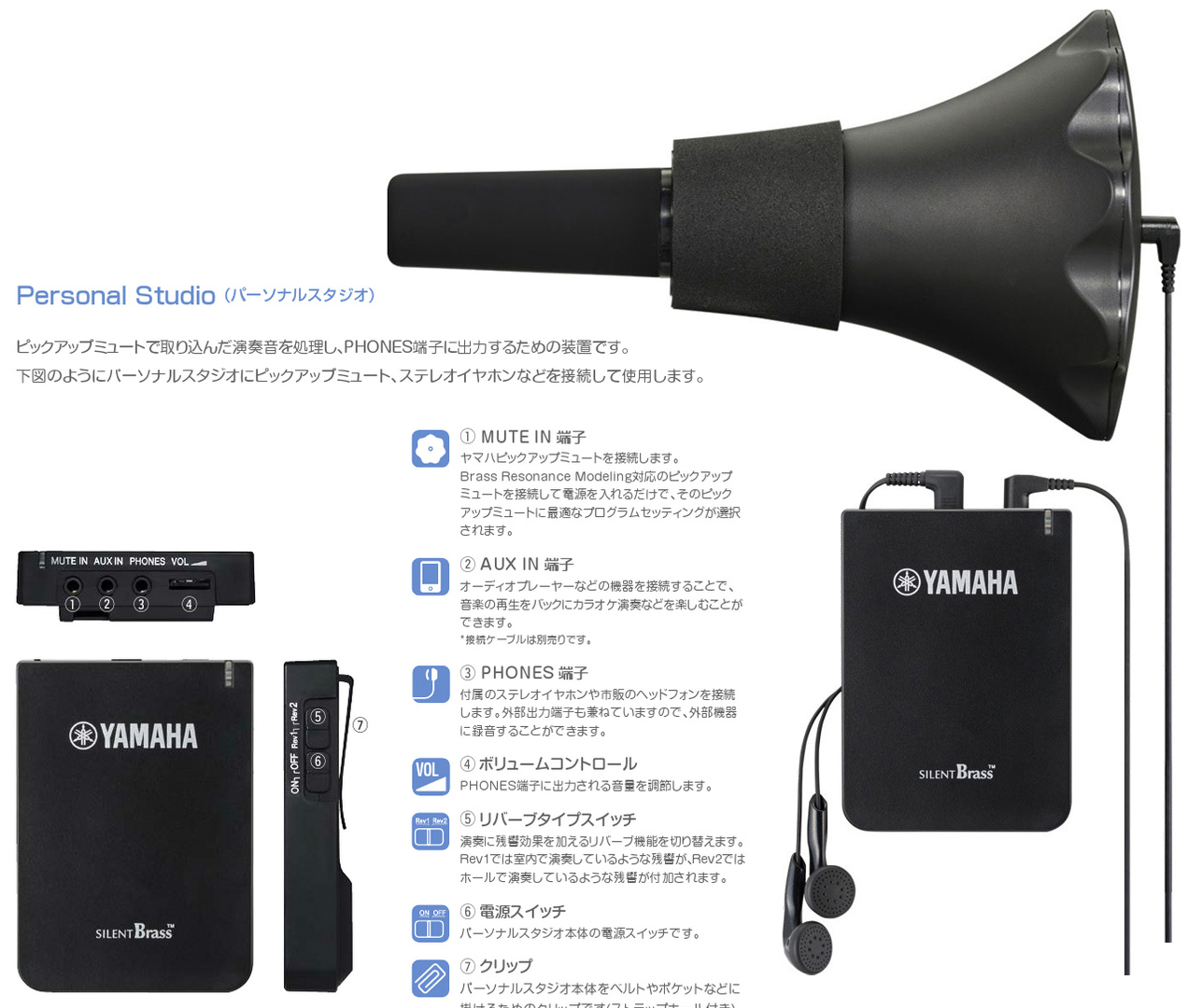 ■楽器本体 ■YAMAHA SB5X サイレントブラス (付属品:専用接続ケーブル、ステレオイヤホン、取扱説明書)サ イレントブラスとは楽器の音を小さくし、より練習ができるように開発された電子機器です。通常金管楽器のミュート(弱音器/消音器)はプラスチック、アル ミなどの素材で作られており、楽器のベルにはめ込んで音を小さくしたり、音質を変えることができます。サイレントブラスは、これだけでは終わりません。出 た音をお手持ちのイヤフォンやヘッドフォンを通して聴くことができます。 ~ピックアップミュート PM5X 部分~ ■Brass Resonance Modeling対応 ■テナートロンボーン用、テナーバストロンボーン用 ■ピックアップ端子:ミニフォンジャック ■内蔵マイク:エレクトレット・コンデンサーマイク ■消音程度:-25dB~-35dB ■サイズ:129 × 220mm ■重量:155g ※細かい仕様が画像と異なる場合がございます。 ~パーソナルスタジオ STX-2 部分~ ■エフェクト:リバーブ (Rev1/Rev2) ■入力端子 :MUTE IN AUX-IN=ミニステレオジャック PHONES(ヘッドフォン/イヤフォン)=ミニステレオジャック ■コントロール:音量 ボリューム 電源スイッチ (OFF/ON) Rev1/Rev2(リバーブ) ■電源:単三電池×2本 (アルカリまたはニッケル水素電池:別売) マンガン電池で約12時間の連続使用が可能 ■外形寸法:70 × 20 × 98mm ■重量:69g(乾電池除く)