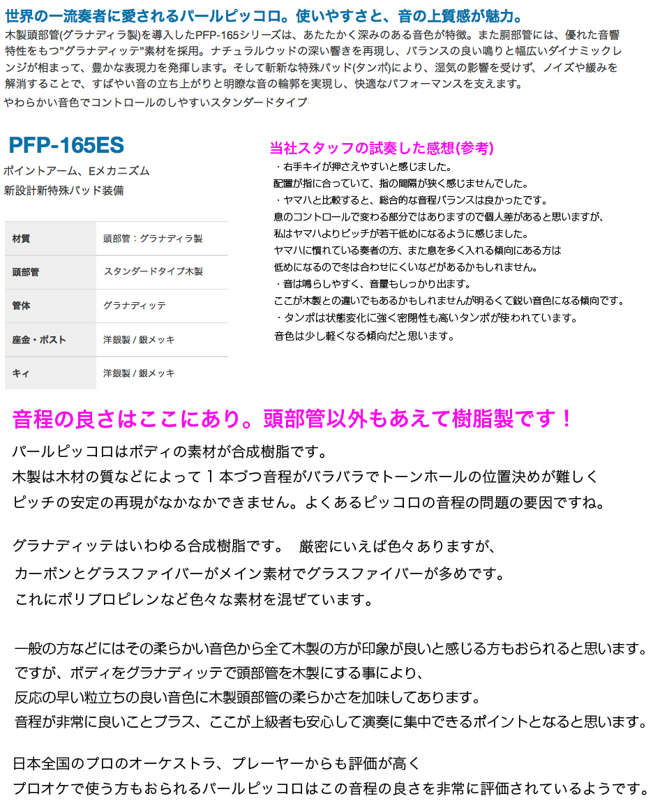 PEARL FLUTE Piccolo PFP-165ES パールフルート 木製 ピッコロ PFP165ES木製頭部管(グラナディラ製)は、あたたかく深みのある音色が特徴。また胴部管には、優れた音響特性をもつ”グラナディッテ”素材を採用。ナチュラルウッドの深い響きを再現し、バランスの良い鳴りと幅広いダイナミックレンジが相まって、豊かな表現力を発揮します。そして斬新な特殊パッド(タンポ)により、湿気の影響を受けず、ノイズや緩みを解消することで、すばやい音の立ち上がりと明瞭な音の輪郭を実現。