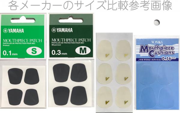 ヤマハではSサイズ、Mサイズなどとサイズが少し異なるものがありますが、バンドーレンは1種。ヤマハのMサイズ相当と思っていただいていいと思います。ソプラノサックスでサイズが大き過ぎてはみ出るなどがあれば切るか少し下目に貼るといいと思います。