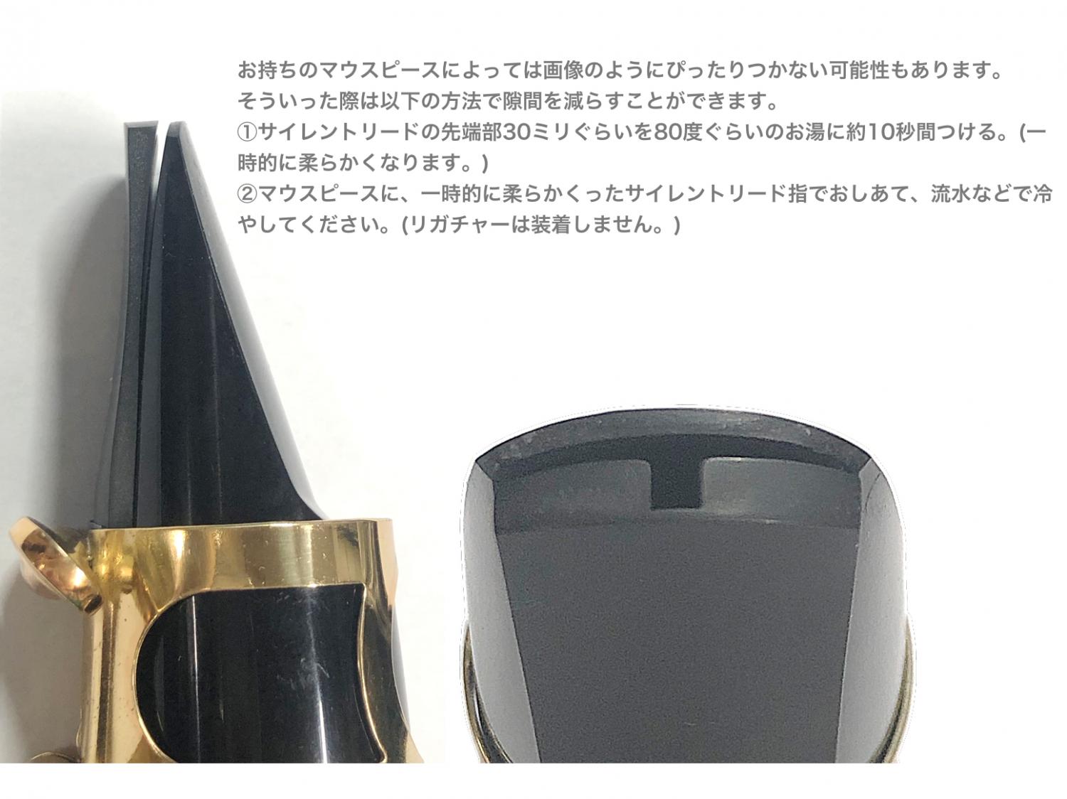 ▼音量について サイレントリードは音は小さくなるのではなく音がならないように作られています。 ※マウスピースのティップオープニング(マウスピース先端とリードとの隙間)によっては小さい音がなる場合があります。 ~対処方法~ ・サイレントリードの先端部30ミリぐらいを80度ぐらいのお湯に約10秒間つける。(一時的に柔らかくなります。) ・マウスピースに、一時的に柔らかくったサイレントリード指でおしあて、流水などで冷やしてください。(リガチャーは装着しません。)