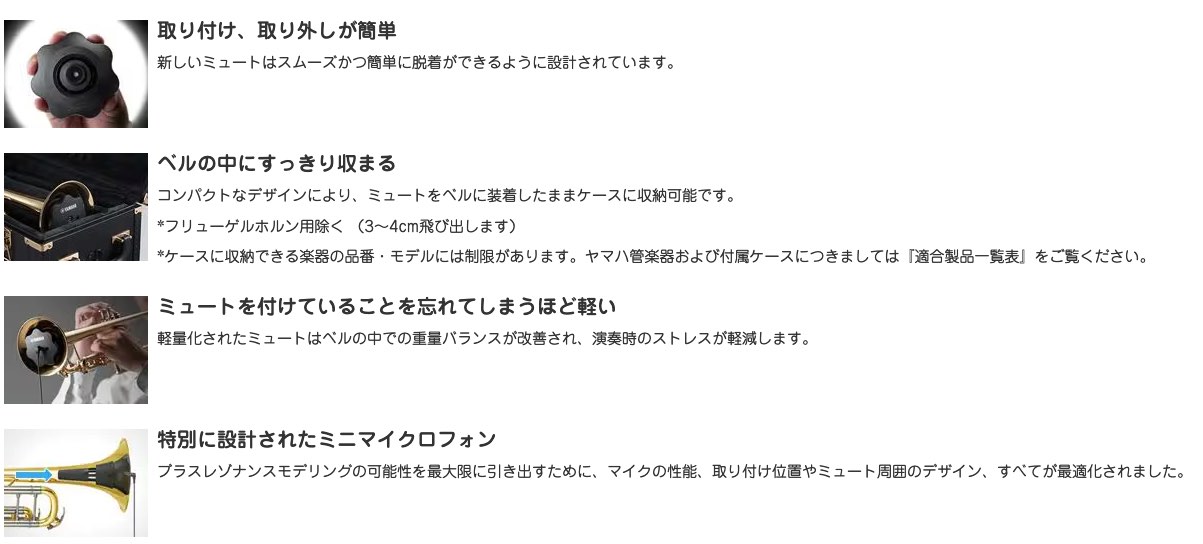 旧モデルからの進化したポイントとしては奏者の好みに合わせてリバーブが調整できるようになり、またUSBケーブルで簡単にパソコンやスマート デバイスに接続し演奏の録音、録画に対応できるようになりました。 ●ブラスレゾナンスモデリングVer.2.0 「ミュートを付けずに演奏した時の金管楽器の特性をモデル化し、ミュートを付けている時の音色を補正する」ヤマハ独自のデジタル技術です。 すべての対応楽器において新たに音響計測を行い、さまざまなアーティストとの対話を繰り返しより 自然な音色を追求しました。3つのプロセスを同時に行い、金管楽器のリアルな音色を再現します。