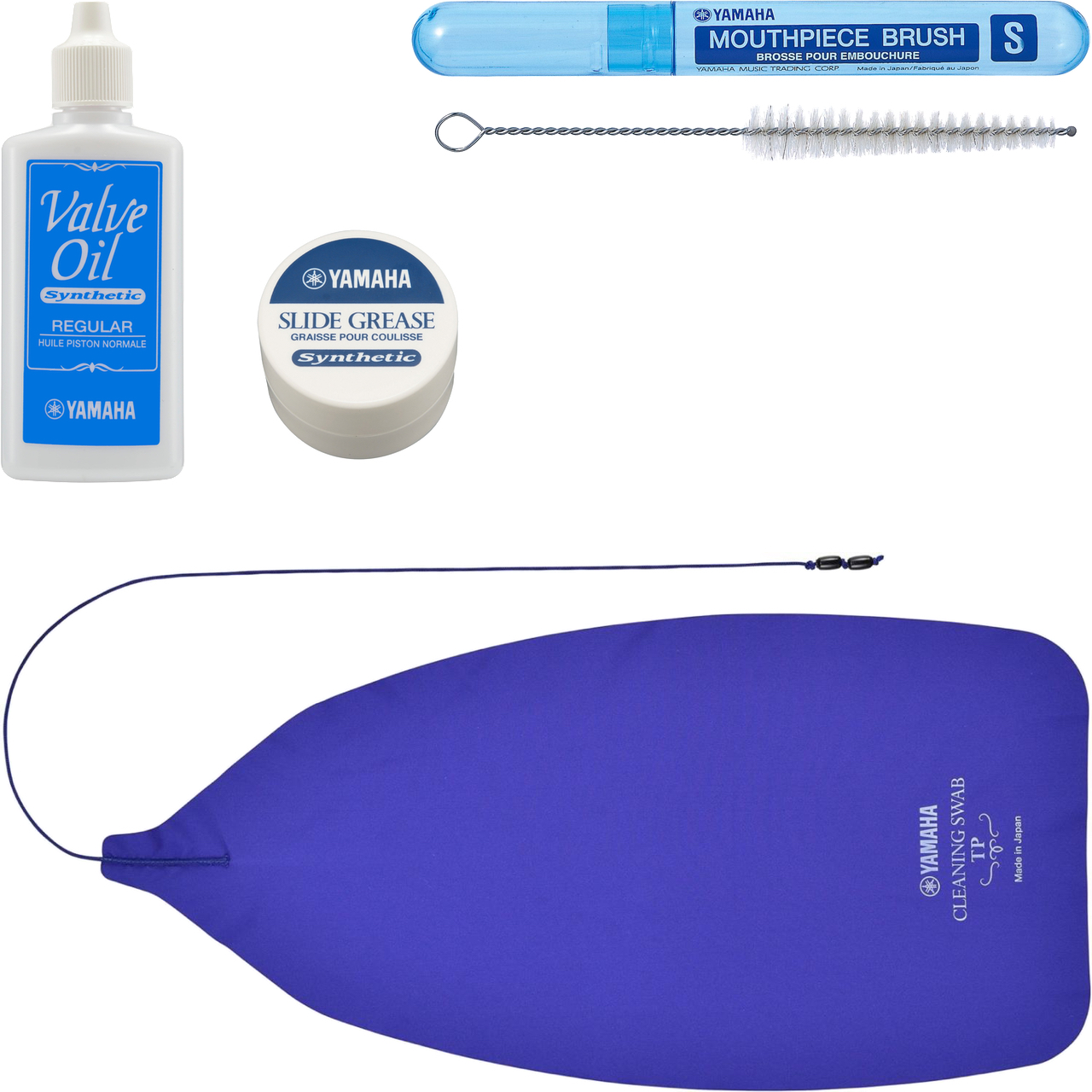 スワブ、バルブオイル、スライドグリス、マウスピースブラシのセットです。トランペット、コルネット、フリューゲルホルンなどにおすすめです。
