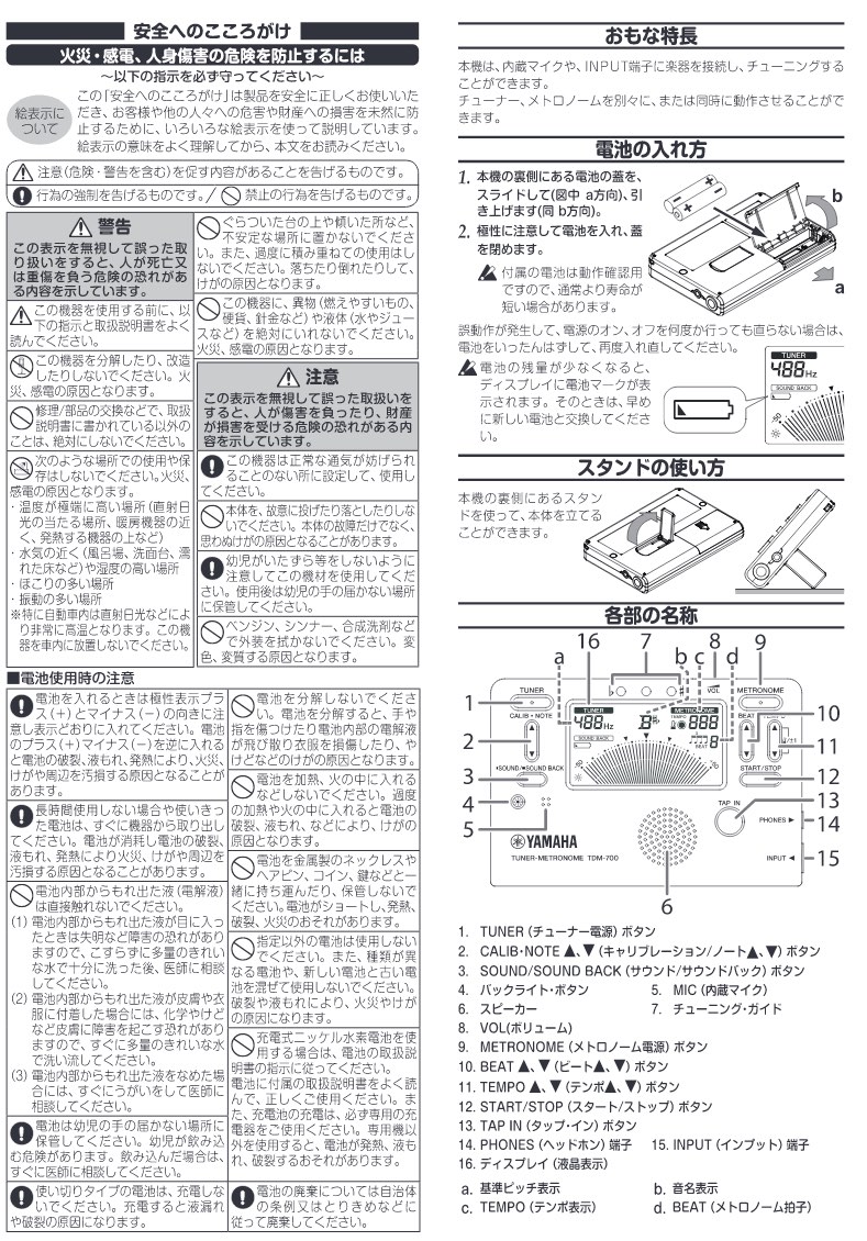 YAMAHA Tuner-Metronome TDM-700 チューナーメトロノーム クロマチックチューナー付き 電子メトロノーム1台で2役!同時に使用できるメトロノームチューナー。液晶画面のサイズが大きく電池寿命も長く使いやすい。チューナーとメトロノームが同時に使えるのは管楽器の練習にはかかせませんよね。吹奏楽では綺麗なハーモニーを奏でるためにも、疲れやクセで段々と下がってしまうピッチ、指遣いによって微妙にアンブシュアを変えたりと演奏中にも一定の音を保つ必要があります。曲の演奏中には手がふさがっていますので、音を聞きながらメーターでチューニングができるのはいちいち切り替える必要がなくとても便利です。