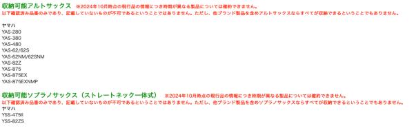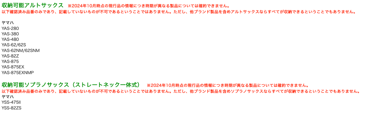 以下確認済み品番のみであり、記載していないものが不可であるということではありません。ただし、他ブランド製品を含めアルトサックスならすべてが収納できるということでもありません。
